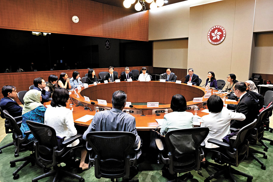 香港特區政府財經事務及庫務局局長許正宇與代表團見面時,就推進香港和粵港澳大灣區與東盟深度合作交流意見。會上,許正宇向代表團介紹香港金融業的最新發展,包括香港多元化、具國際信譽的金融服務優勢,以及在多個金融領域的領先地位─香港是亞洲最大的國際債券發行中心,亦是全球第二、亞洲第一的跨境財富管理中心,同時在對沖基金、風險管理、保險業以及綠色金融方面均處於區內領導地位。他又誠邀東盟成員國積極參與下屆亞洲金融論壇,共同探討更多交流與合作機遇。