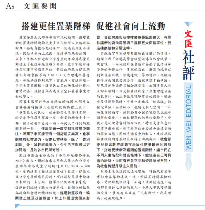 行政長官李家超昨日繼續出訪浙江的行程,期間出席「浙港高層會晤暨浙港合作會議第一次會議」,兩地政府在會議中簽署了包括住房安居的合作文件。李家超指出,浙港兩地會就創新房屋科技、智能建設、節約資源、低碳減排等方面開展交流合作,並就構建幸福社區、智慧屋邨等議題互相加深交流,加深專業人員互訪和培訓。可見特區政府除了注重增建房屋的數量外,也注重住屋環境質素的提升。過去房屋供應緊張時,市面一度出現「納米樓」的住宅單位,面積細小,也缺乏私人空間,一人居住空間尚可,但對於有小孩的家庭來說就會顯得相當狹小,但這類單位仍然相當搶手,背後正是反映着當時部分市民,特別是青年急於置業準備成家,管不着單位是否適合長遠安居的權宜心態。團結香港基金的報告,反映現屆特區政府的房屋政策取得了明顯成效,社會都樂見特區政府能夠在房屋供應量增長的趨勢下,搭建更清晰及暢順的置業階梯,讓市民在不同人生階段和財富條件下,能住進自己可負擔的居所,從而有更多空間和資源發展自我,為社會轉型升級注入動能。
