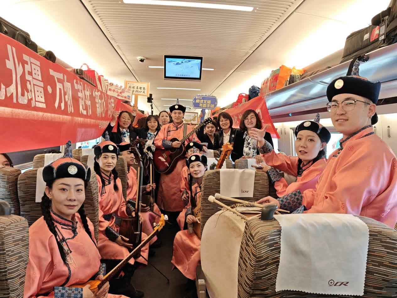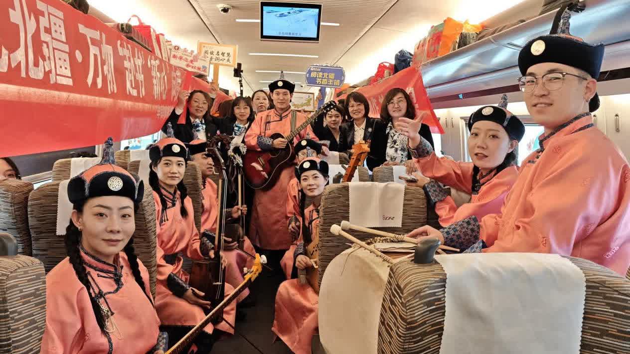 在書目推薦環節,多本展現北疆文化與時代精神的佳作被傾情分享。隨後,器樂合奏《草原新年》奏響,歡快節奏將活動氛圍推向高潮,帶領乘客沉浸式感受北疆文化的獨特魅力。列車抵達北京北站時,呼包鄂烏四城五地代表與北京西城區人員共同唱響《為內蒙古喝彩》《我和我的祖國》,歌聲飽含深情,傳遞對家鄉與祖國的讚美與熱愛。
