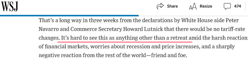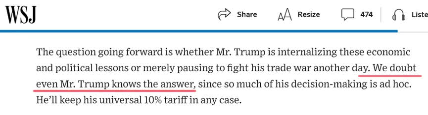 這篇社評中的核心觀點其實很直白,認為自4月初宣布對全世界加徵「對等關稅」,並對中國進行極限施壓以來,白宮在過去的這20多天一直在不斷做出調整:先是給除中國以外的其他一些國家寬限90天,然後是給蘋果、英偉達等大企業開後門,再到如今準備大幅減輕對中國的關稅。