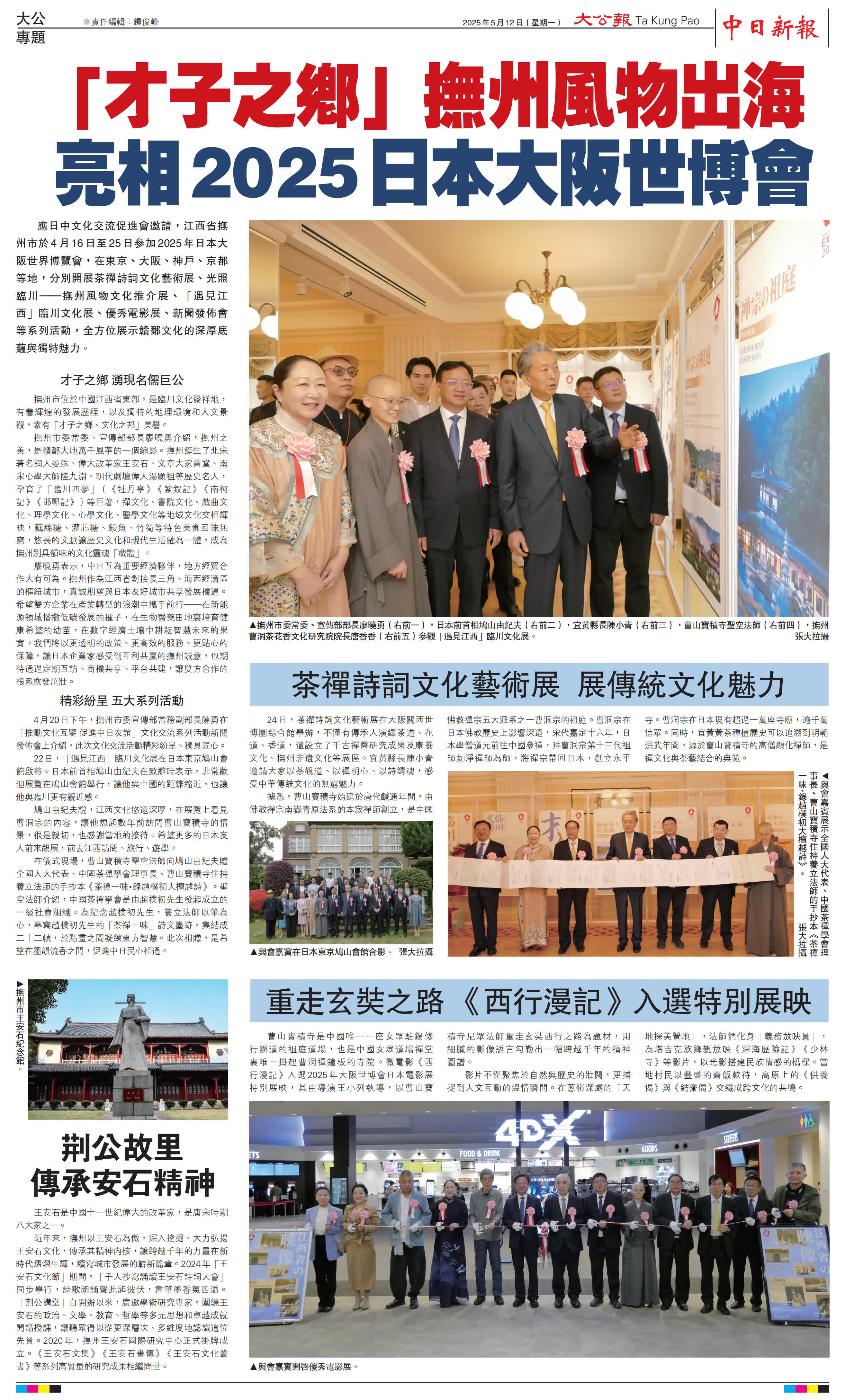 應日中文化交流促進會邀請,江西省撫州市於4月16日至25日參加2025年日本大阪世界博覽會,在東京、大阪、神戶、京都等地,分別開展茶禪詩詞文化藝術展、光照臨川——撫州風物文化推介展、「遇見江西」臨川文化展、優秀電影展、新聞發佈會等系列活動,全方位展示贛鄱文化的深厚底蘊與獨特魅力。