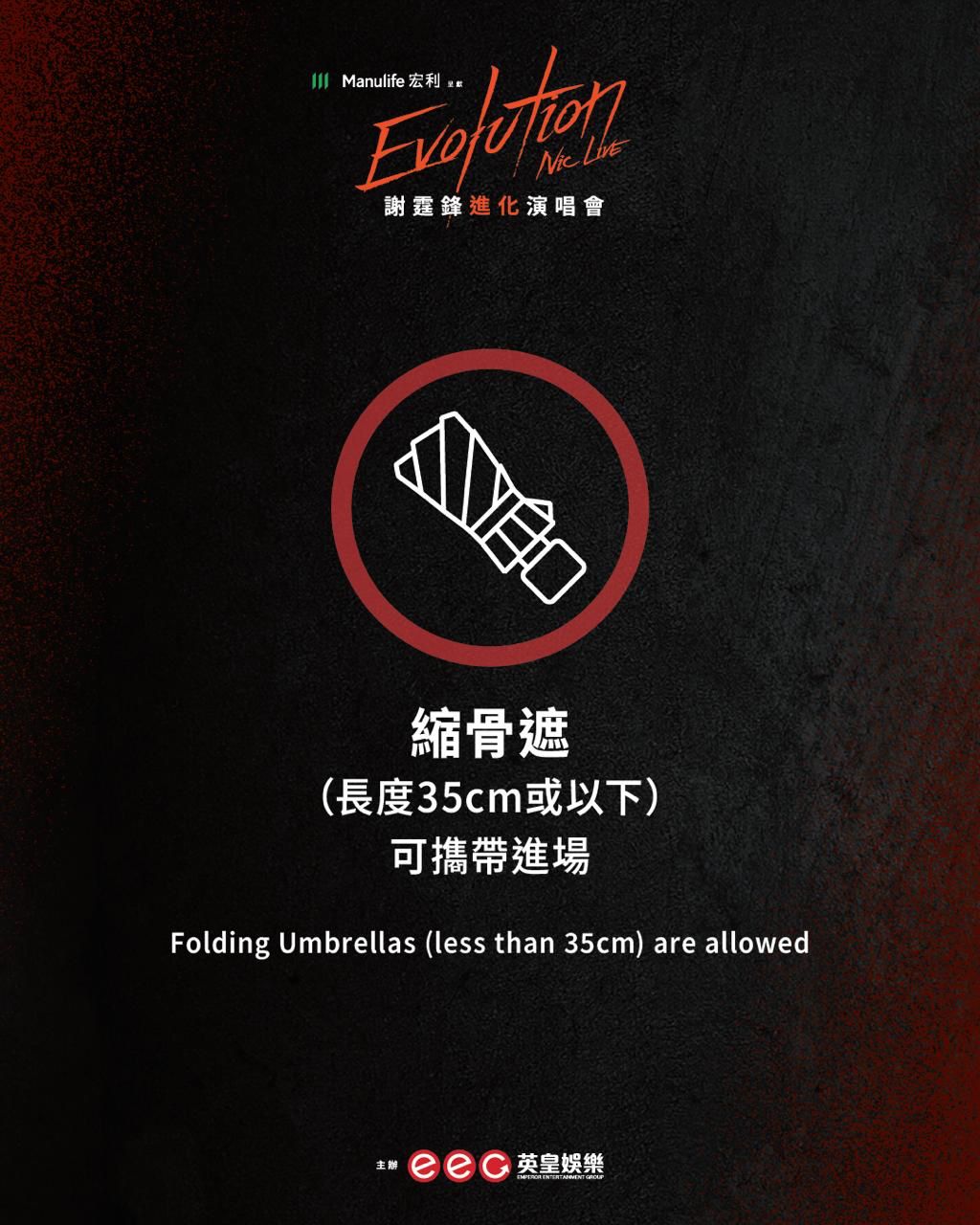 享受美食之餘,啟德體育園觀眾務必帶雨具,以防當日天公不作美。因演唱會禁止攜帶長度超過35厘米的長柄傘入場,在雨具的選擇上,觀眾可選擇摺疊傘。