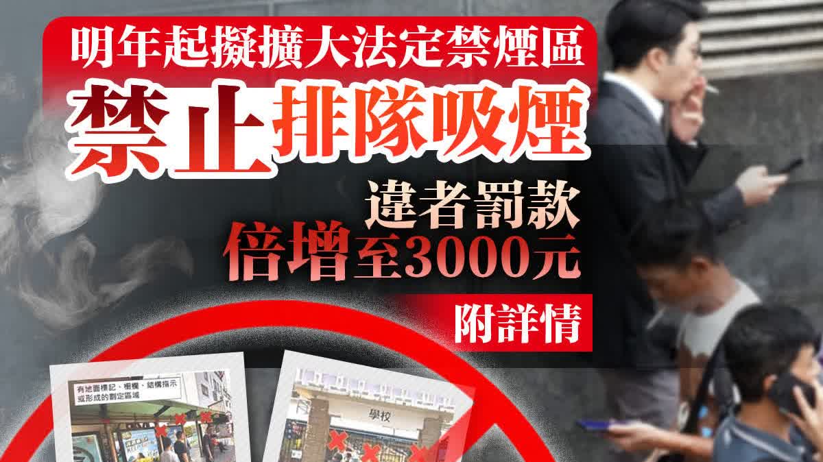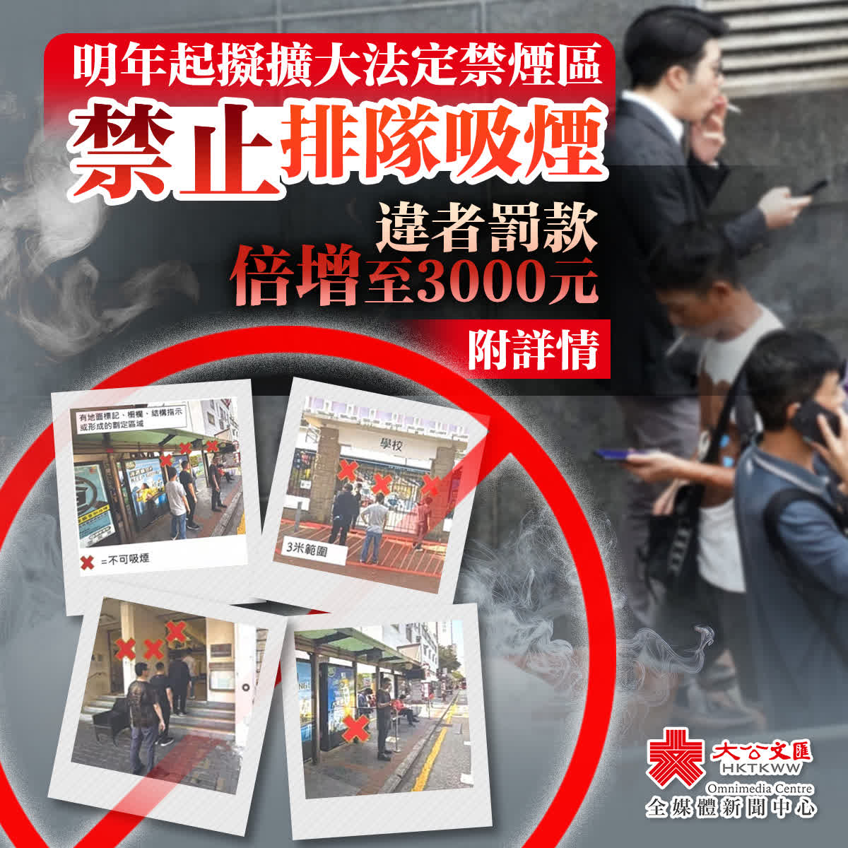 草案擬將禁煙區擴大至指定處所(如學校、醫院)出入口3米範圍,並賦權醫務衞生局局長訂立大範圍禁煙區。同時,吸煙罪行定額罰款將從1500元提高至3000元,並於2026年1月1日生效。
