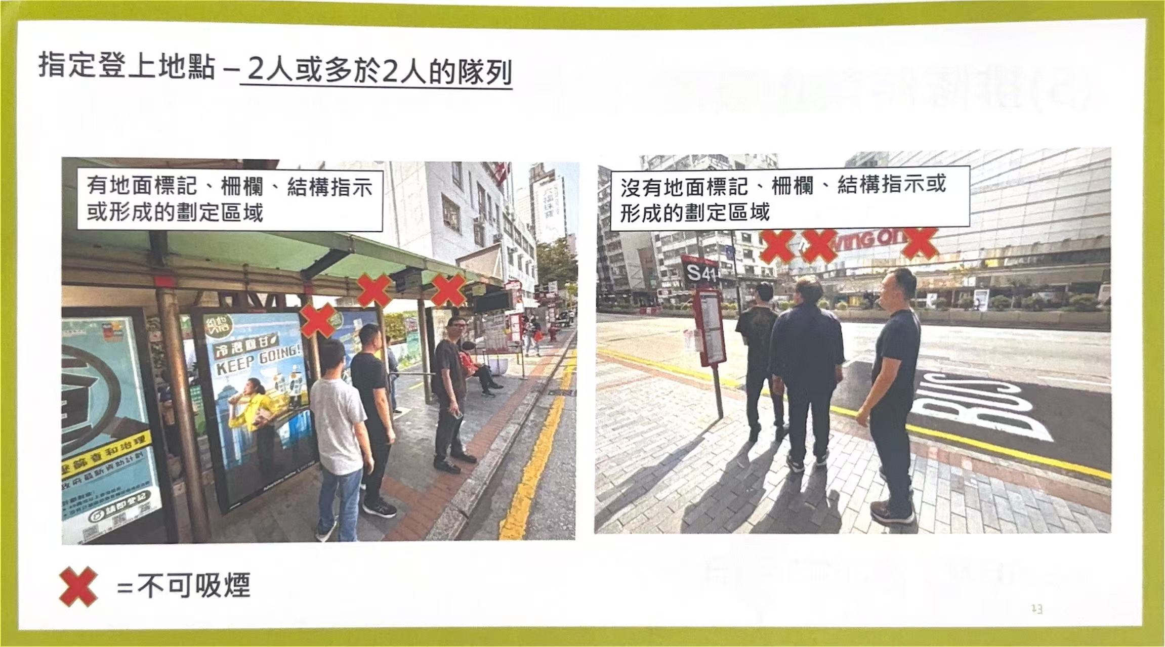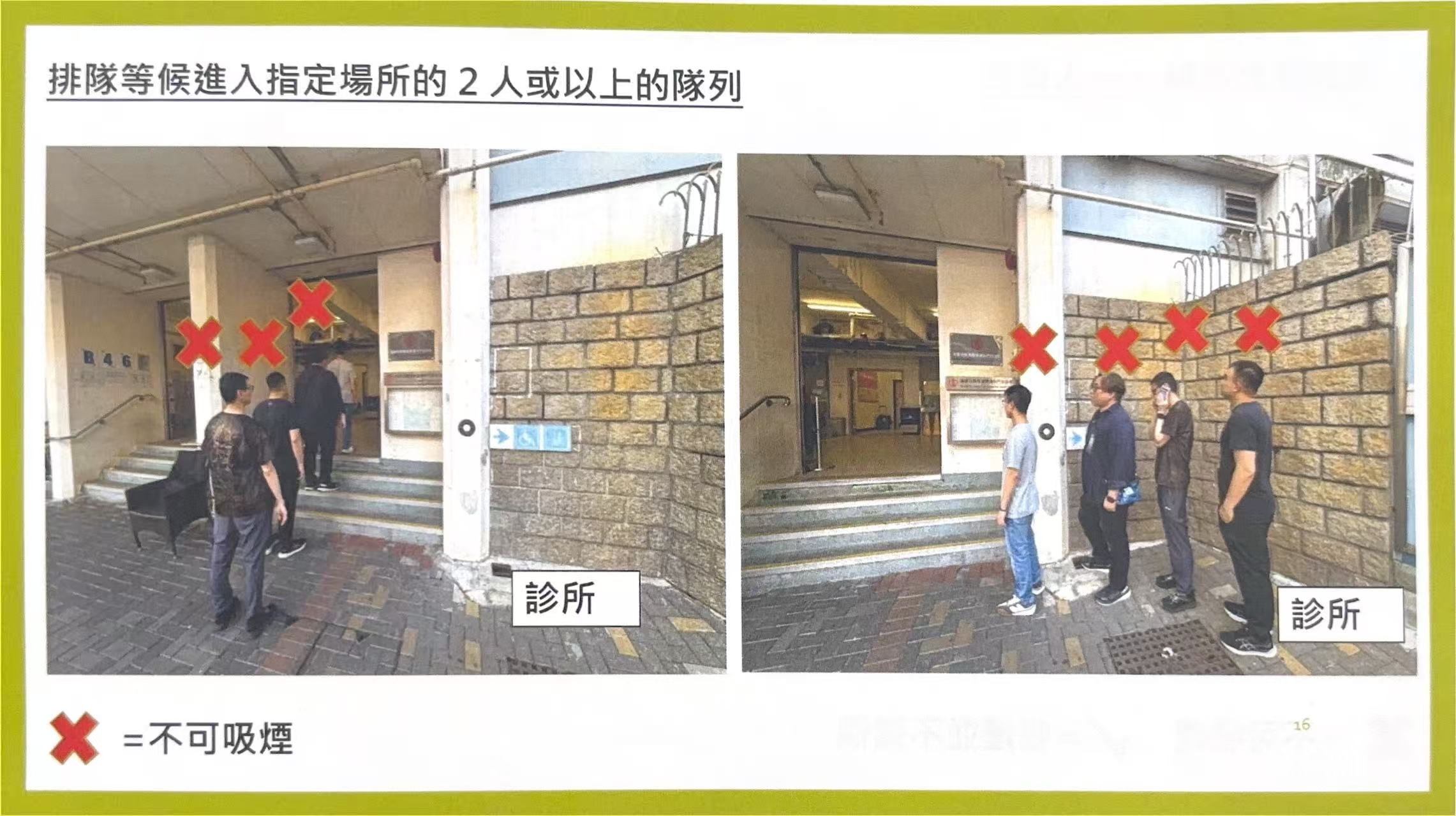 草案禁止在指定登上交通工具地點,在2人或多於2人的隊列中輪候登上公共交通工具時作出吸煙行為。此外,草案亦禁止進入有較高人流量或易出現人龍的指定處所(如醫院、學校、體育場館、西九文化區、海洋公園、迪士尼樂園等)時,或兩人或以上在指定處所範圍(包括室外)輪候,或身處輪候隊伍準備進入指定處所吸煙,違者可被處以定額罰款,將於2026年1月1日生效。
