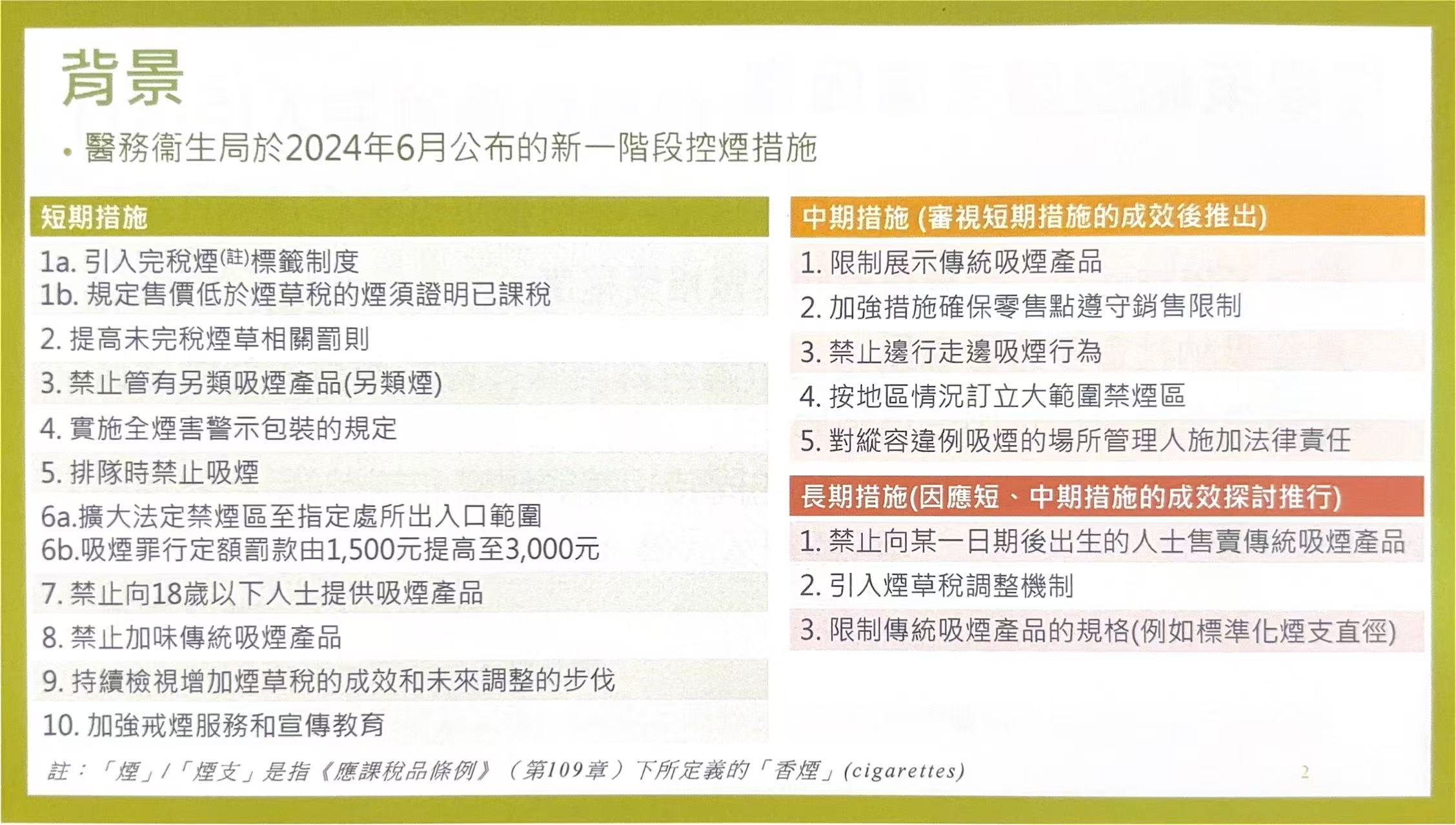 香港特區政府此次推出的《2025年控煙法例(修訂)條例草案》,旨在從需求管控、產品規範、公共環境保障及戒煙服務四個方向入手,計劃分階段實施一系列短、中、長期措施,為香港打造更健康的無煙環境。