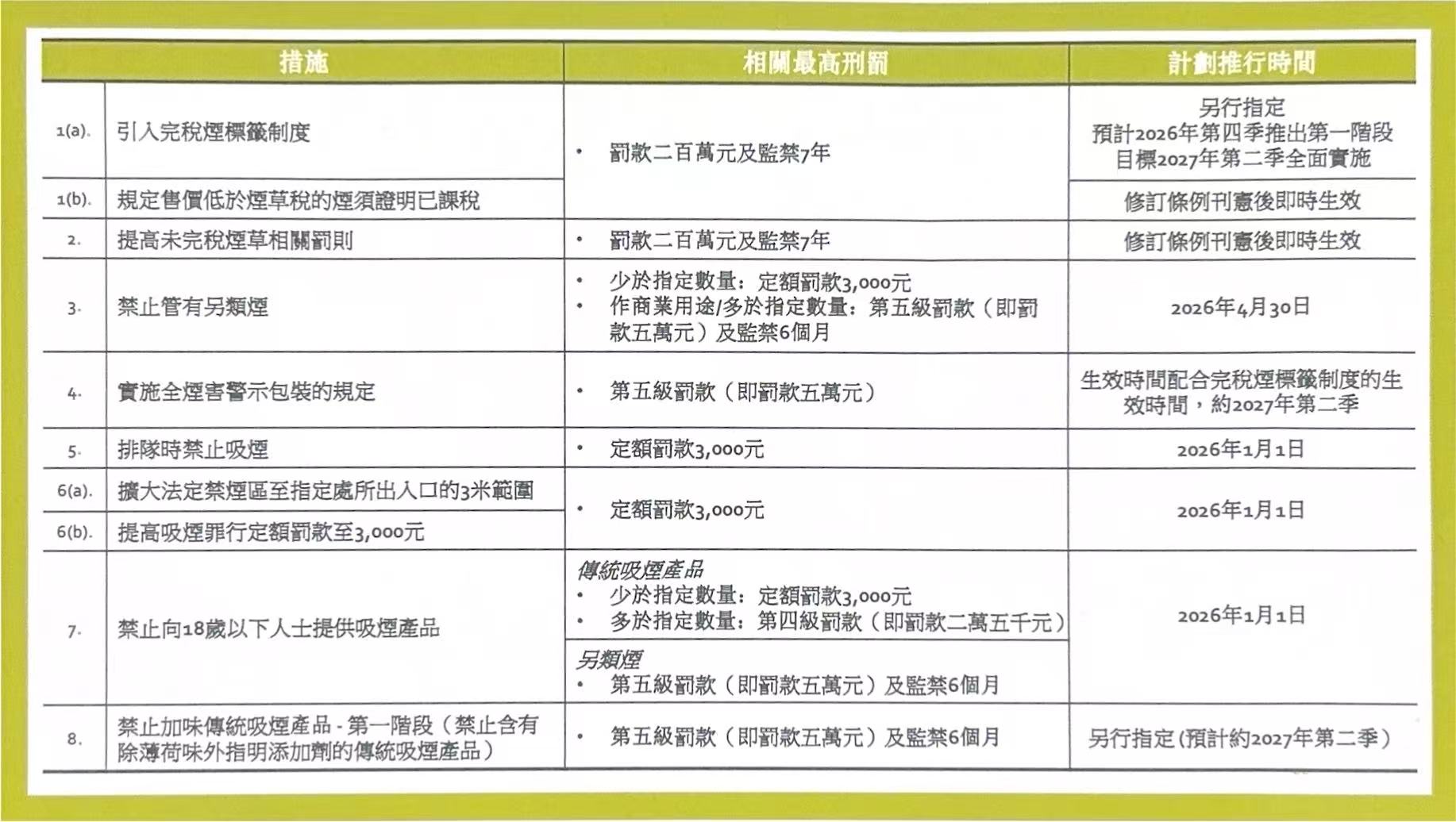 草案將未完稅煙草罪行的最高罰則提升至罰款200萬元及監禁7年,並將相關罪行列入《有組織及嚴重罪行條例》附表,允許凍結犯罪資產。同時,對未申報罪行的罰款從2000元提高至5000元,以嚴厲打擊非法煙草活動。