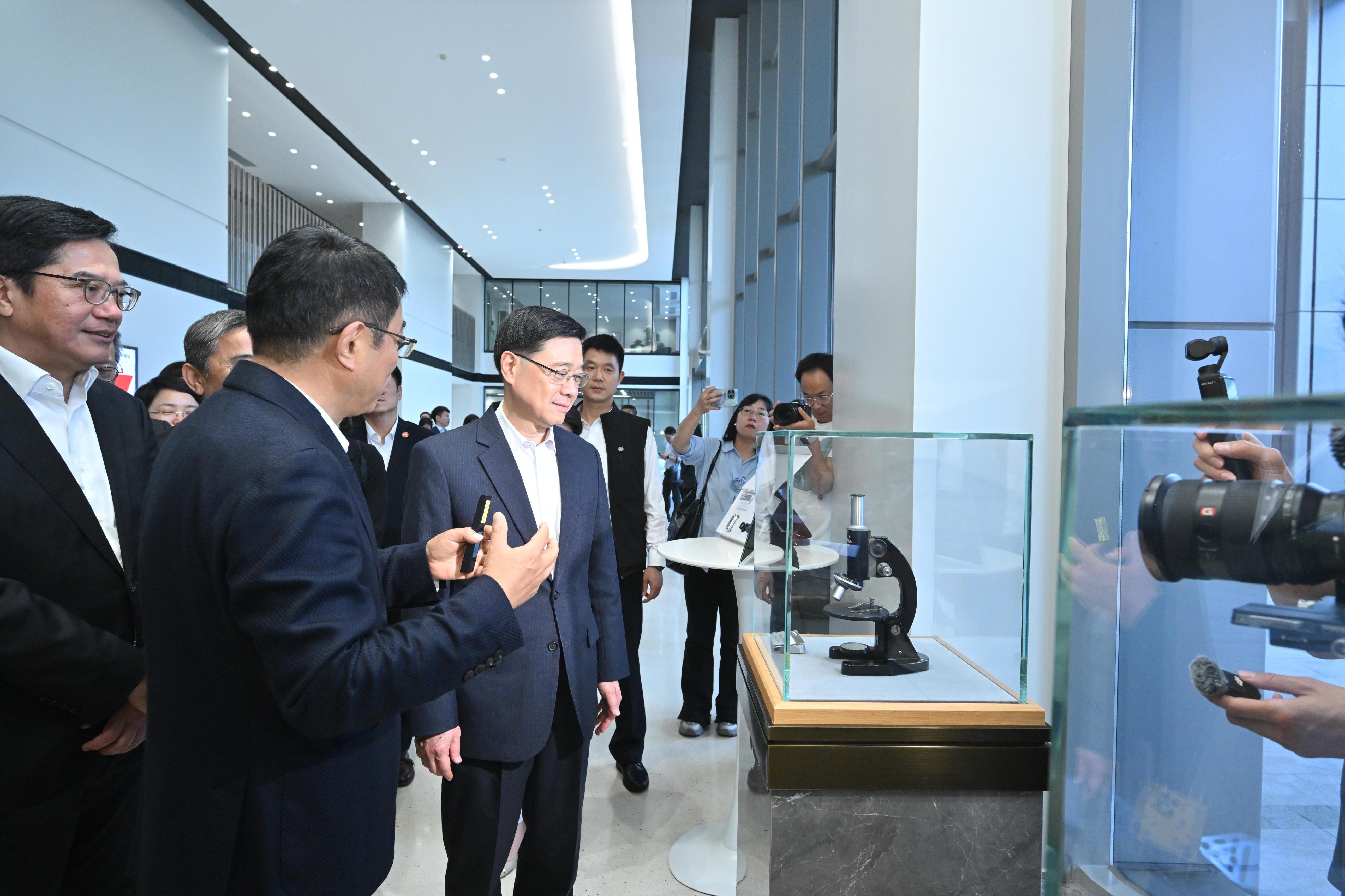 李家超仔細察看港企研製生物顯微鏡。李家超表示,從解析生命奧秘的高端顯微設備,到助力太空探索的精密光學元件,處處體現曹老先生「產業報國」精神的時代傳承。