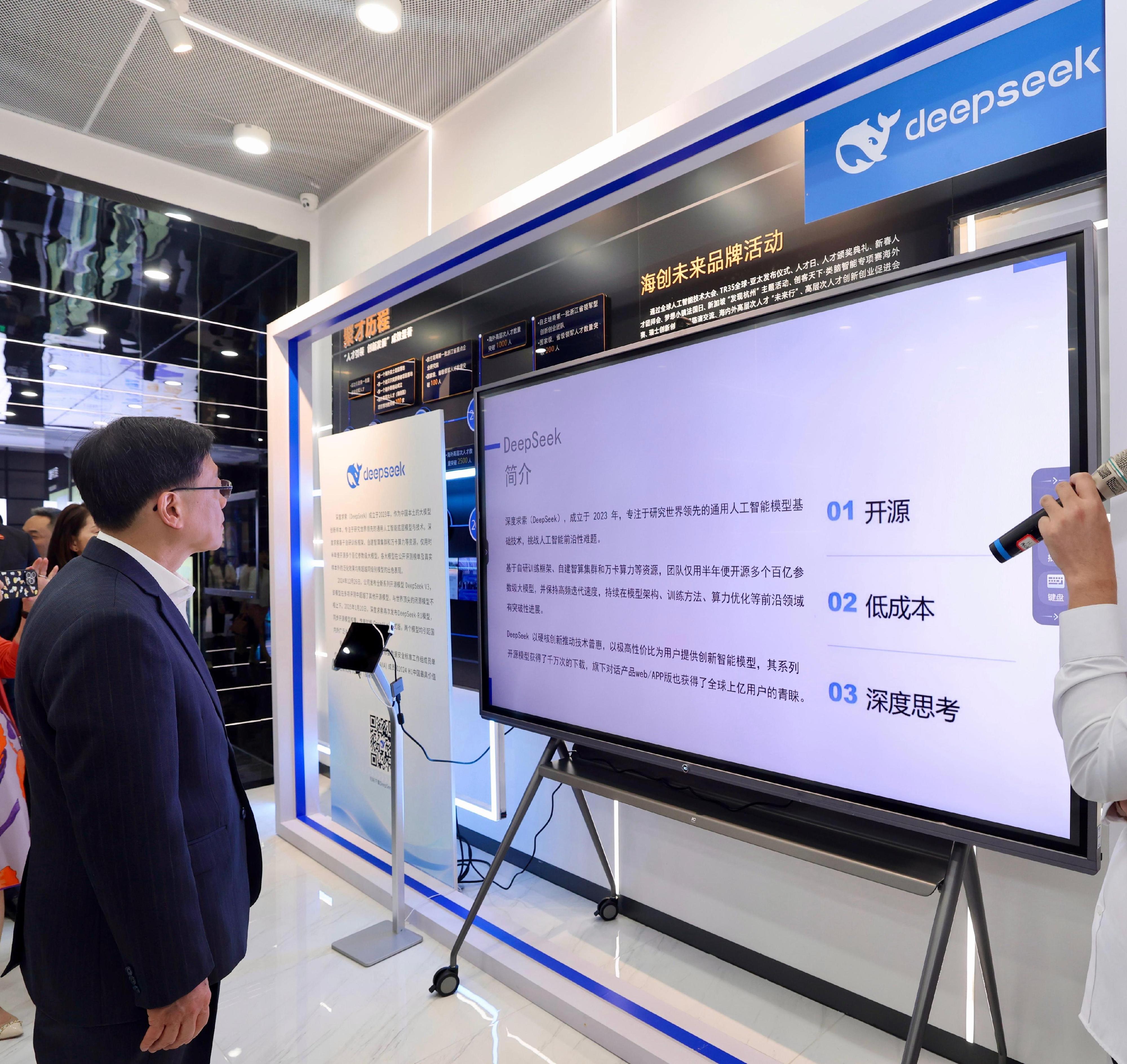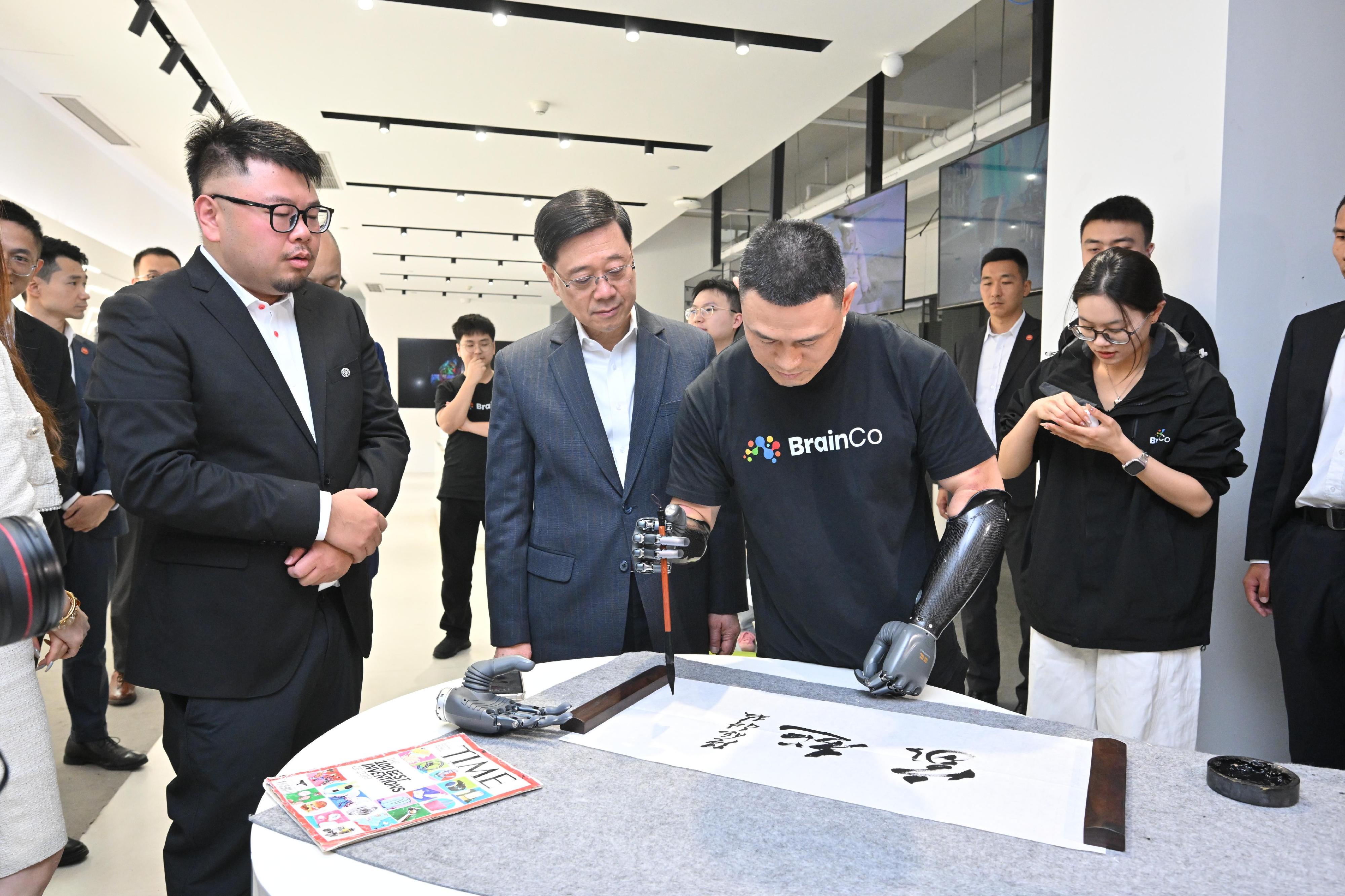 李家超了解杭州在智慧城市、人工智能等領域的發展。展館專門為特區政府訪問團設置了專題展覽,展示「杭州六小龍」的核心成果與前沿技術。深度求索(DeepSeek)、宇樹科技、遊戲科學、群核科技、雲深處科技、強腦科技等「杭州六小龍」企業代表分別介紹了各自在大語言模型、機器人、人工智能、遊戲開發和腦機接口等新技術領域的發展和特色。李家超現場體驗了遊戲科學推出的遊戲「黑神話:悟空」。