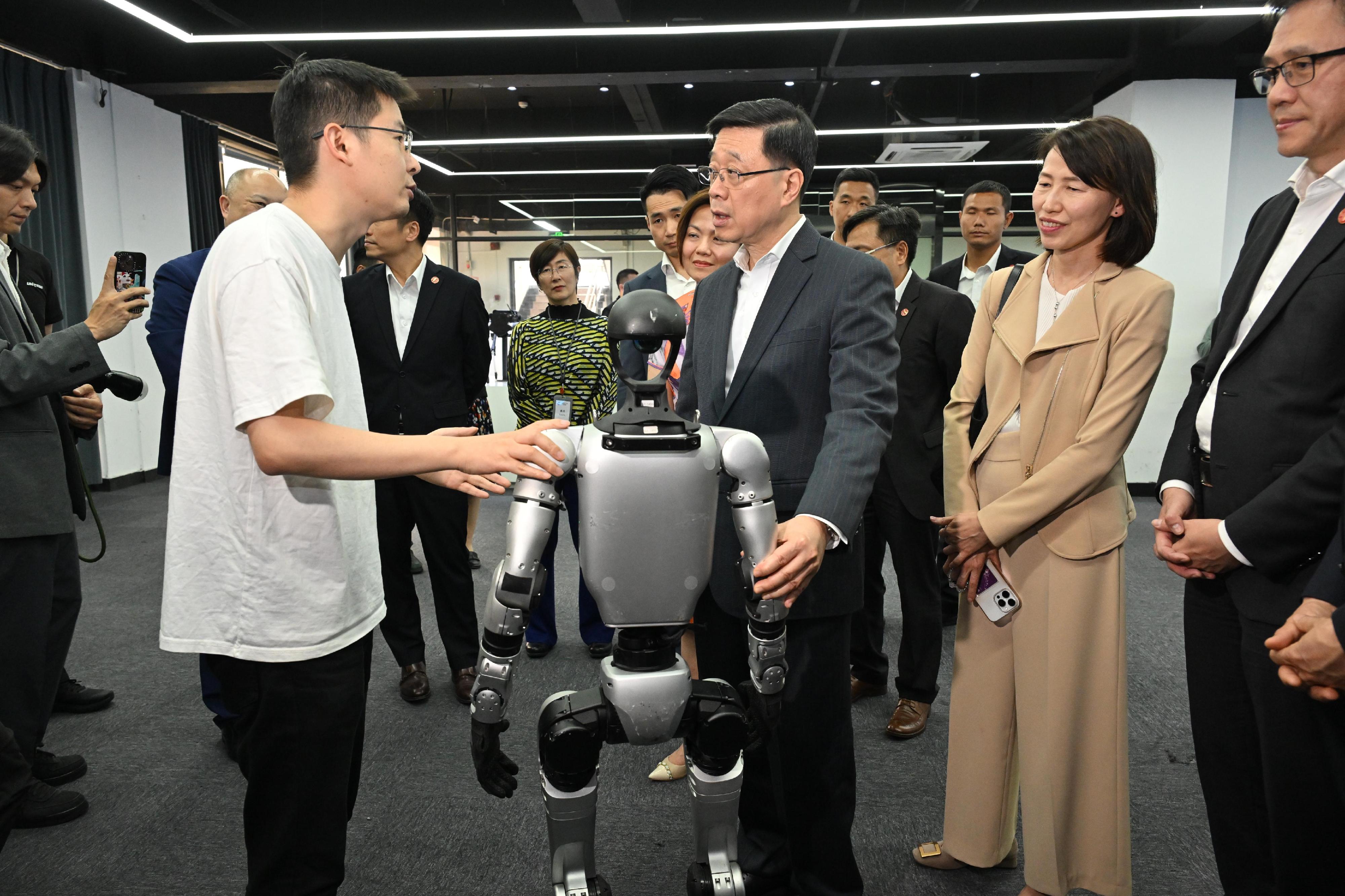 李家超表示,香港特區政府部門早前已經向宇樹科技購入機器人作試驗和探討,其機器人亦曾在三月在香港商場與市民互動,相信市場對機器人的需求會越來越多。他鼓勵宇樹科技來港拓展業務,特區政府亦可提供所需支援。