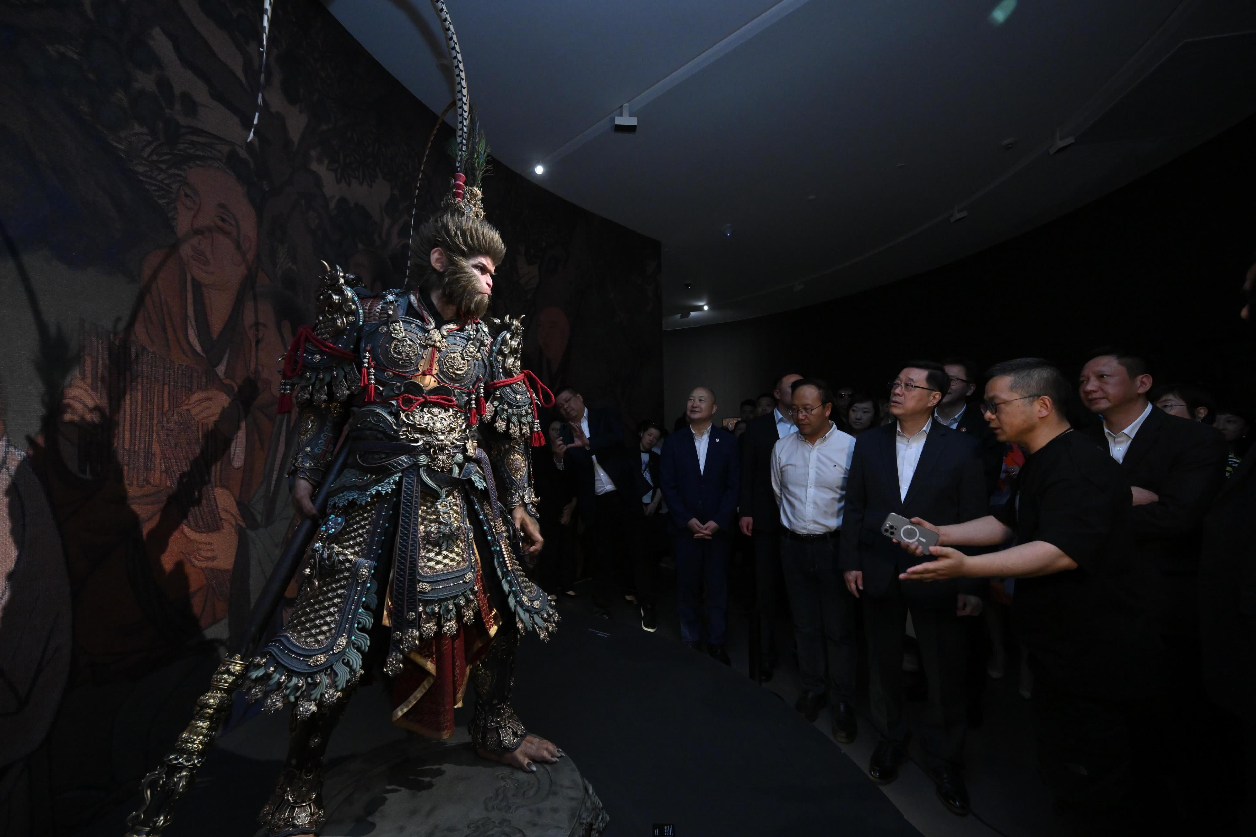 李家超表示,遊戲中的虛擬角色和道具以實物呈現,包括作為遊戲主角的天命人全身像和純金打造的金箍等,透過展品展現遊戲製作細節和其開發故事。內地科技讓遊戲製作能力大幅提升,而遊戲熱潮掀起漣漪效應,帶旺周邊產品和成功打造文化IP項目,更彰顯中國傳統神話的吸引力以及打通中西市場的表達方式。