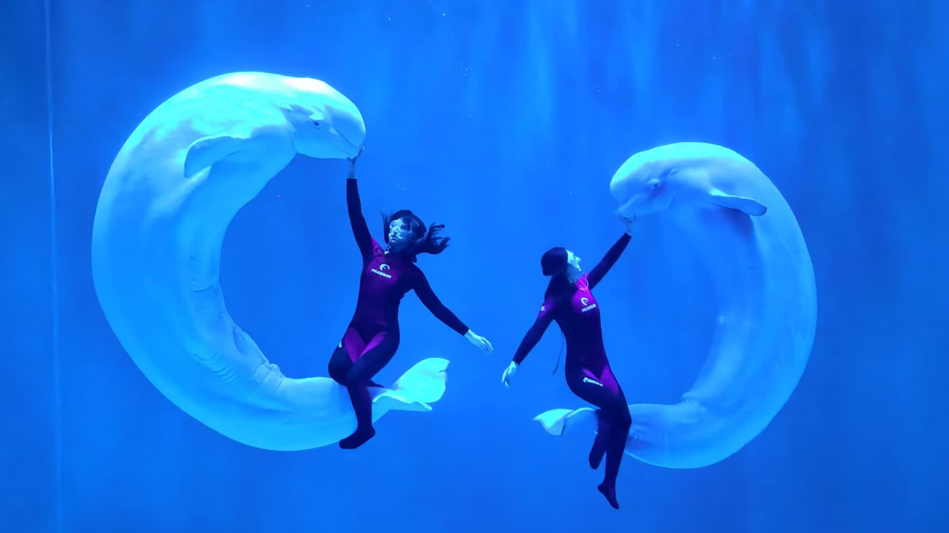 哈爾濱極地公園全新白鯨秀以誕生十六周年獻禮為契機,傾心打造全球首創高難度新動作「海心同吻」,兩隻白鯨同時對台下觀眾隔空「飛吻」,這一動作歷經近一年精心打磨,實現了全球範圍內的首創演繹。與此同時,「一見傾心」「天使光環」等經典動作也進行了全方位升級,新增「雙人雙鯨」與「一人雙鯨」交替演繹模式,觀眾不僅可以觀賞到四鯨同遊的宏大氣勢,也能領略雙鯨雙環的細膩巧思,豐富的組合編排讓整場表演層次更為立體,帶來加倍震撼的視覺效果。
