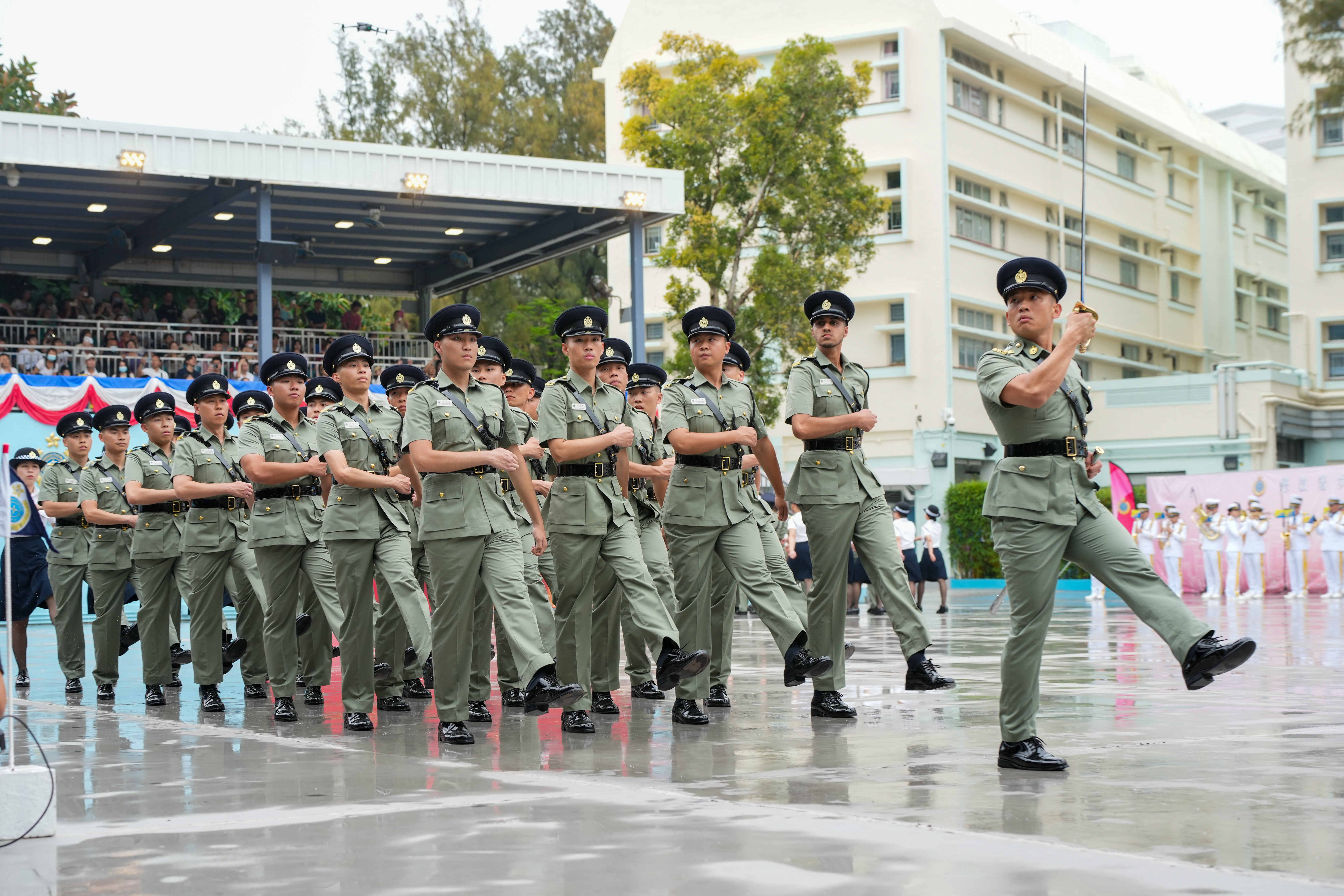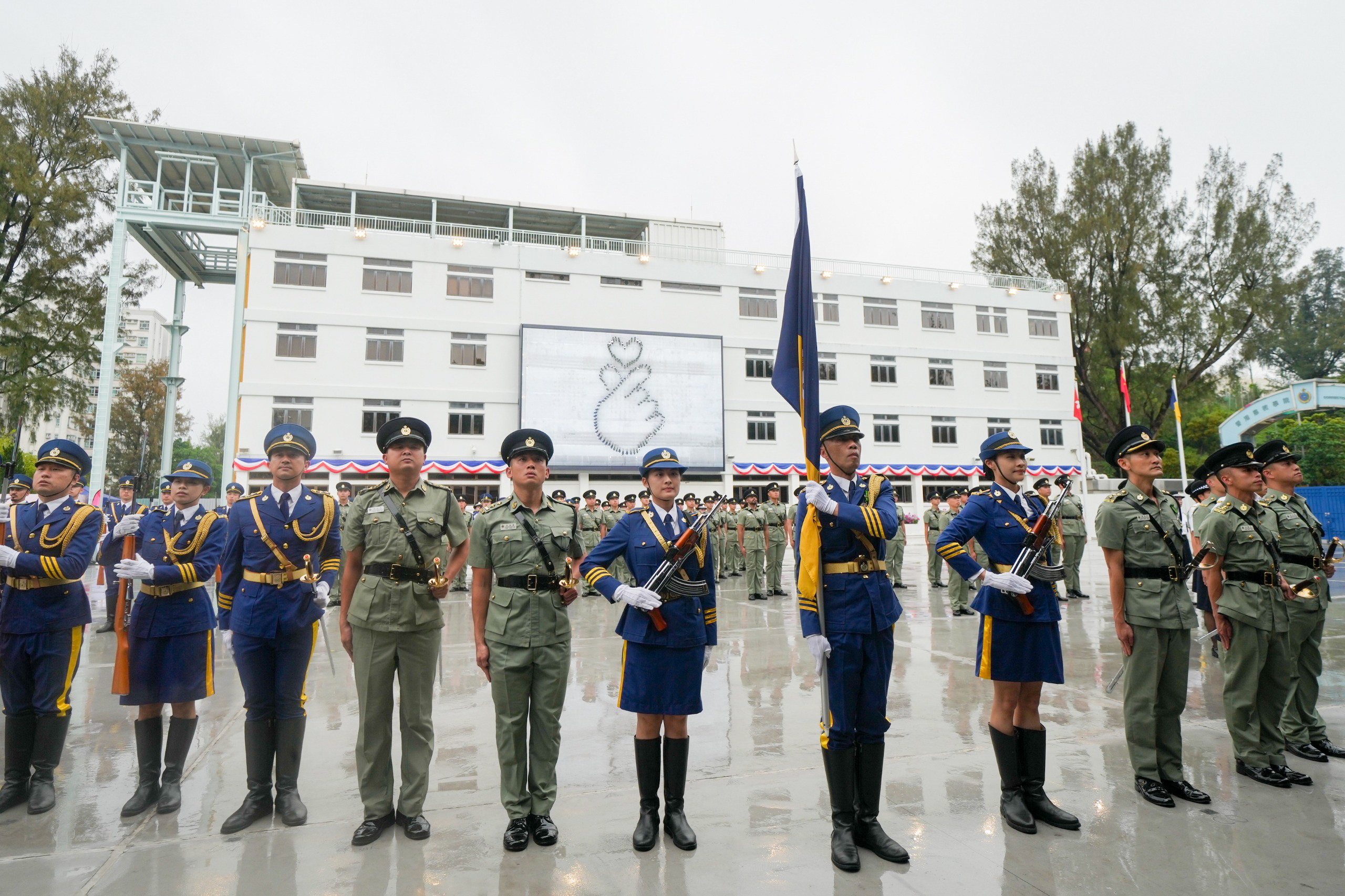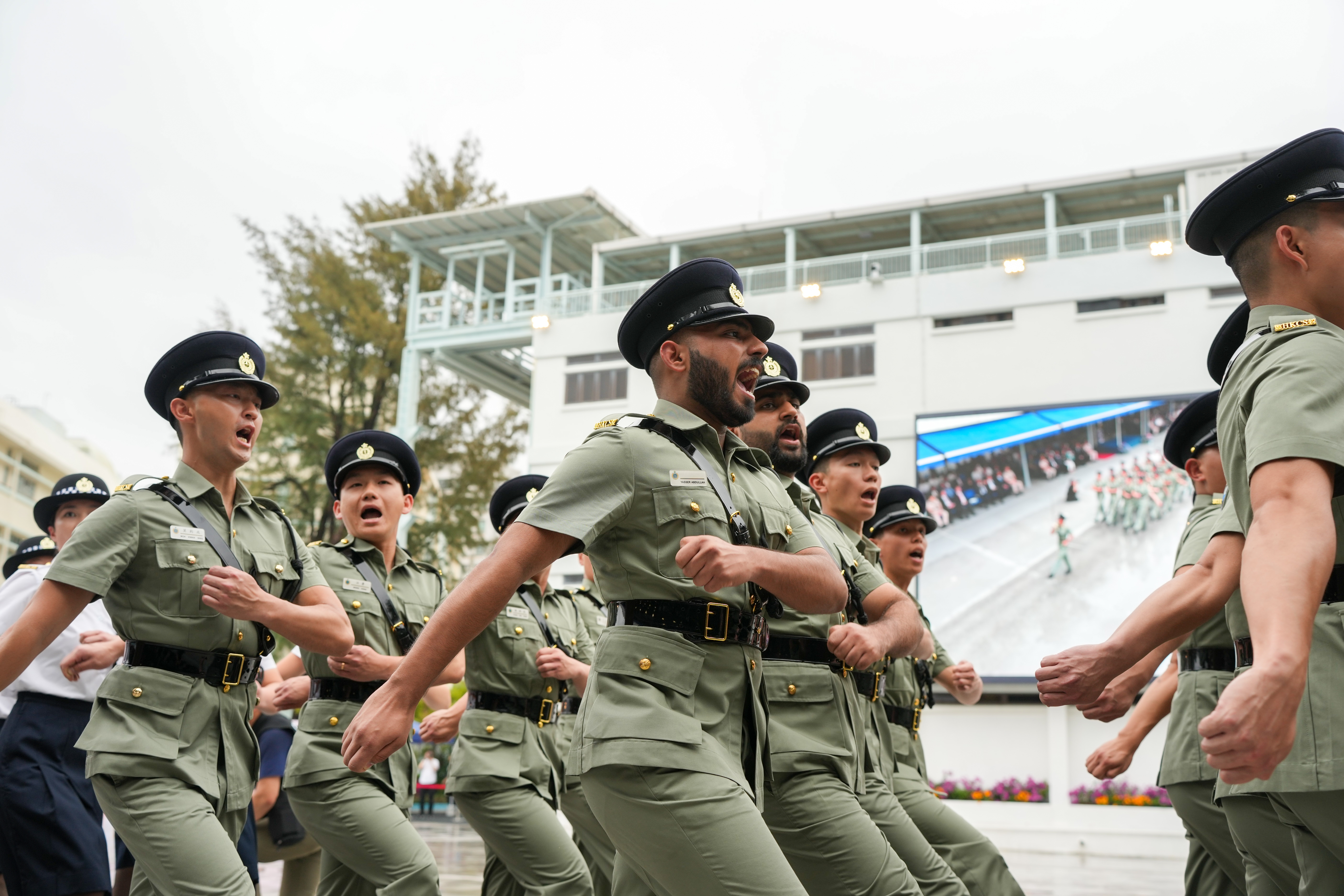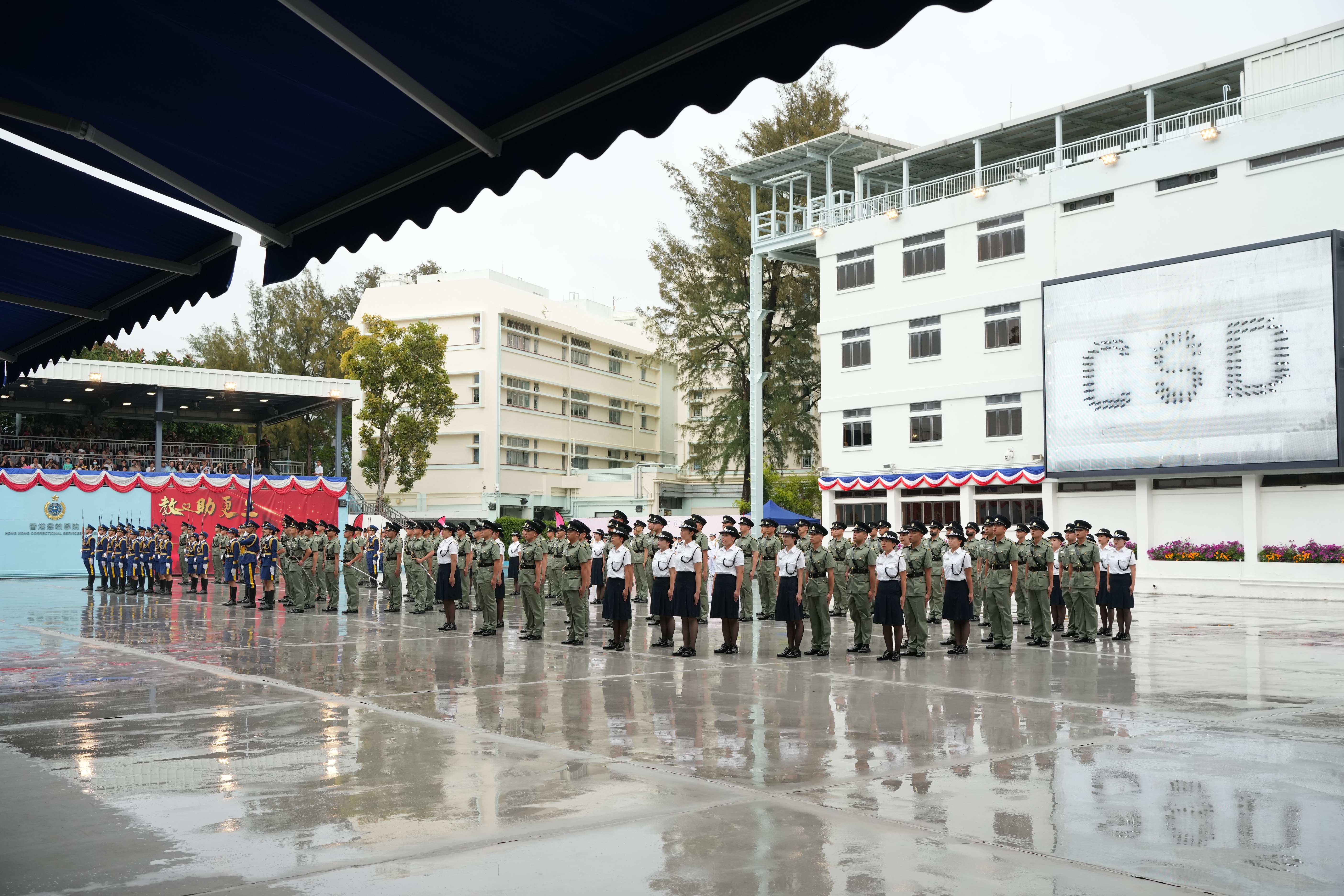 會操中懲教署儀仗隊與結業學員以整齊步伐拼出懲教署的英文縮寫「CSD」及「手指俾心」圖案,表現學員心繫香港,準備承擔懲教署守護刑事司法體系最後防線的任務。