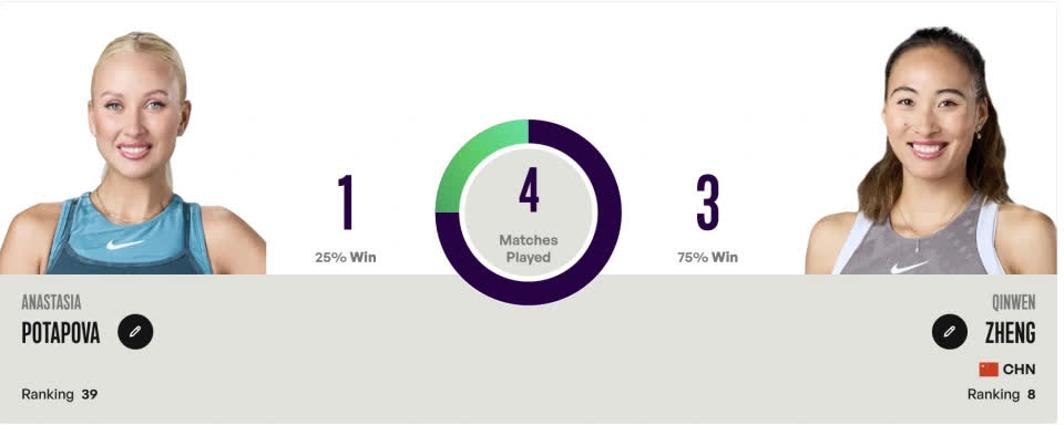 鄭欽文和波塔波娃此前有過4次交鋒,均在硬地,鄭欽文3勝1負佔據優勢,最近一次是2024年迪拜站直落兩盤輕鬆獲勝。但其餘三場均陷入鏖戰,四場共計9盤比賽出現5次「搶七」。