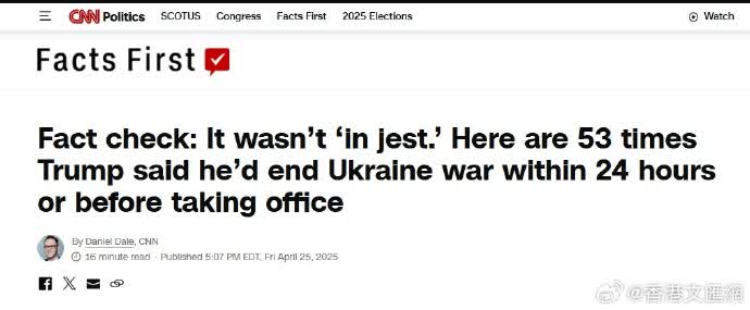 美國有線電視新聞網(CNN)則對一個收錄了特朗普公開言論的數據庫進行了查詢,統計數據顯示,特朗普至少發表過53次類似的言論,即聲稱他會在24小時內或者在就職前就能結束俄烏衝突。