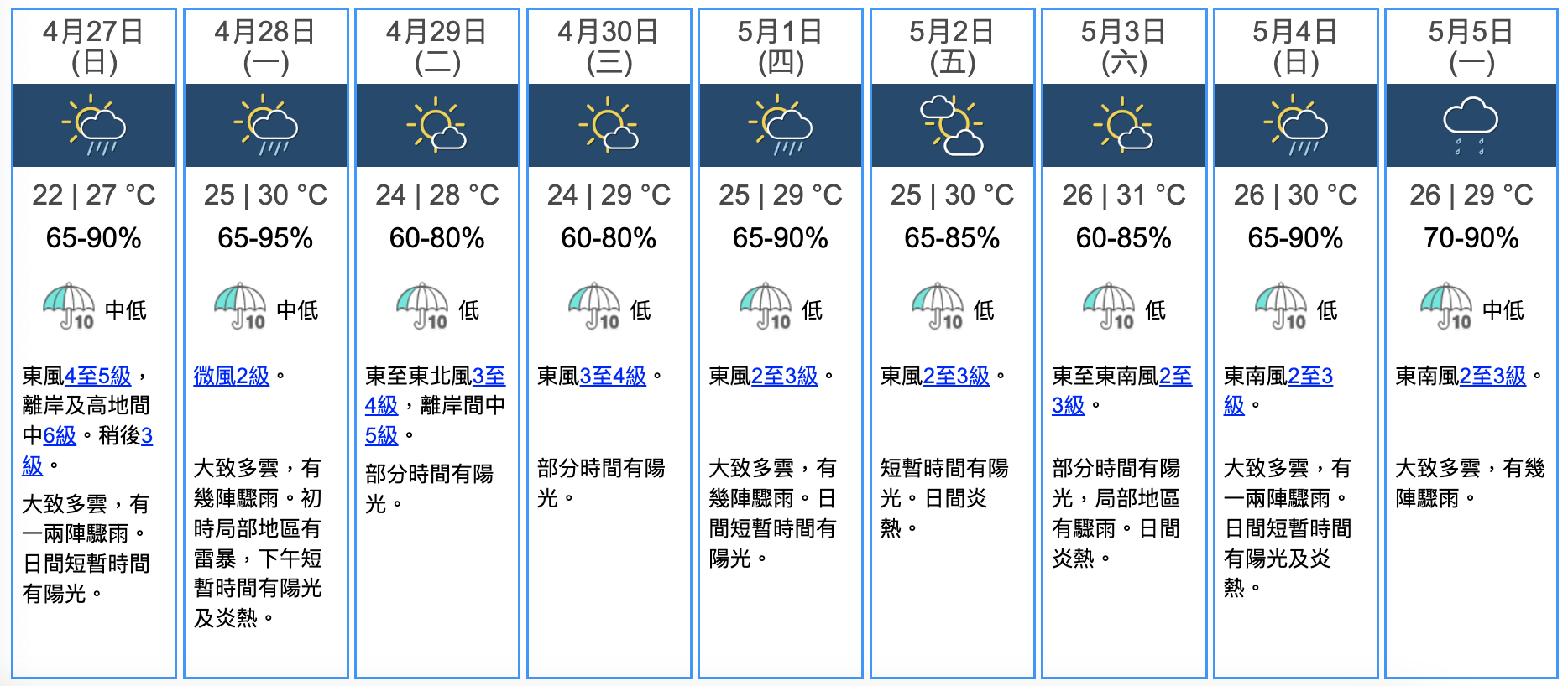 根據天文台9天天氣預報,明日(27日)大致多雲,有一兩陣驟雨,氣溫介乎23-27度,周一(28)天氣更升至30度,勞動節當日天氣仍然炎熱,介乎25至29度,但天文台預料大致多雲,有幾陣驟雨;下周六(5月3日)天氣更為炎熱,最高氣溫升至31度,而佛誕當日最高氣溫下降至29度,但有幾陣驟雨。