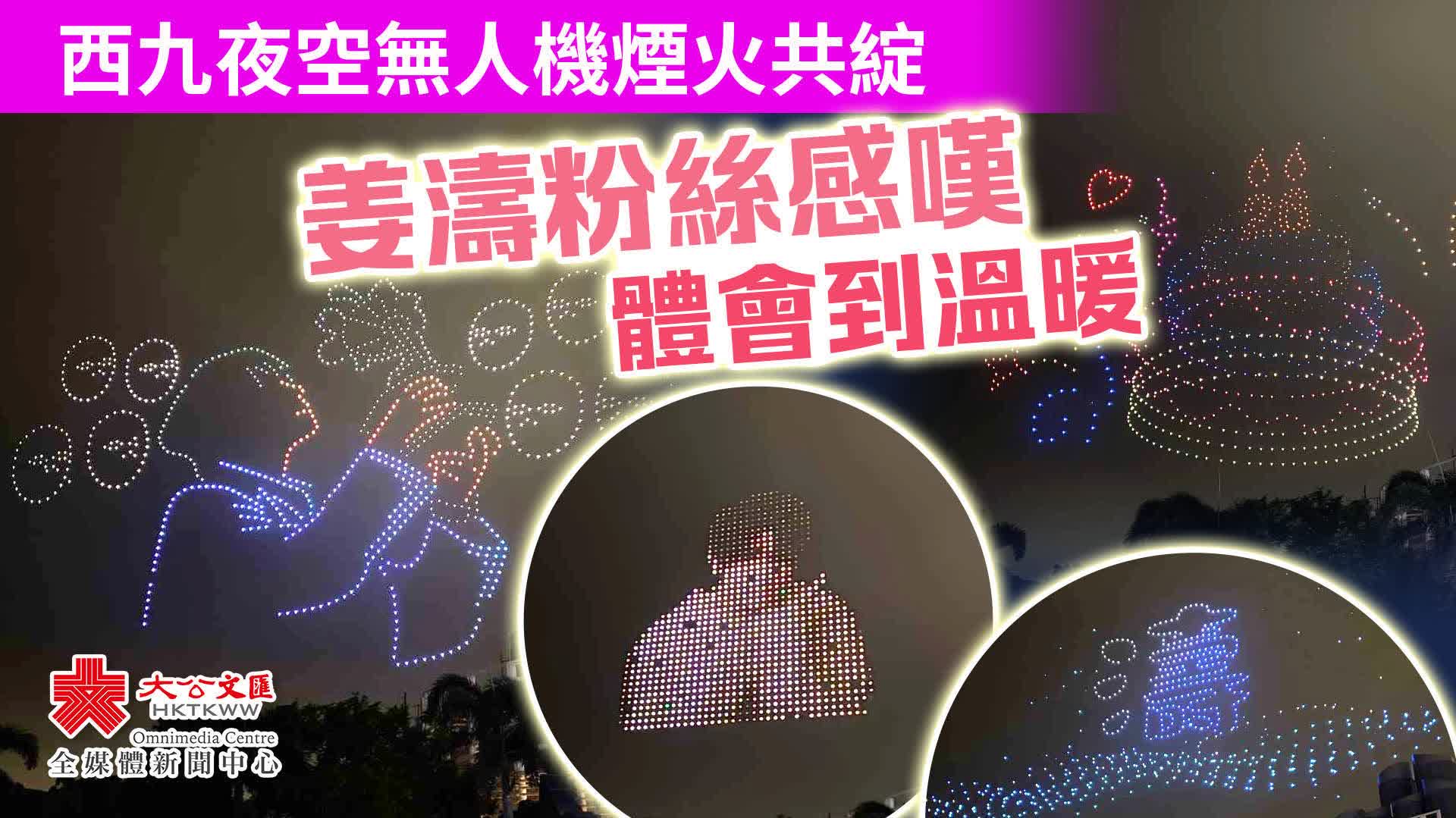 夜幕降臨,活動迎來終極高潮。上千架無人機於西九上空編隊起飛,匯演歷時12分鐘,共14個圖案,拼出姜濤歷年膾炙人口的Hit歌畫面,配合歌曲效果,更創意拼出姜濤彩色相片,畫面震撼動人,令人目不暇接。緊接其後的是璀璨奪目的海上煙火表演,在節奏明快的音樂節拍中綻放出「KT」字樣,瞬間照亮整個西九夜空,將現場氣氛推至頂點,粉絲們興奮揮舞燈牌,高呼鼓掌。