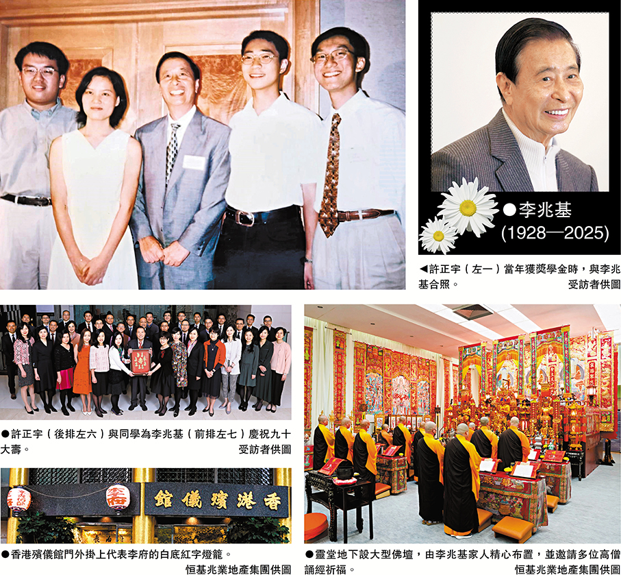 (香港文匯報記者 柴婧)恒基兆業地產集團創辦人、大紫荊勳賢李兆基(四叔)今年3月17日與世長辭,家屬於今日(27日)在北角香港殯儀館設靈。李兆基於香港創業興家,但始終心繫祖國,深明國家要繼續繁榮進步,培育有用人才是基礎,他經年的善舉,令內地和香港大批優秀學子受惠,成長為一代代貢獻祖國、造福社會的有用之才。特區政府財經事務及庫務局局長許正宇把李兆基視為改變他一生的人,他早年正是在李兆基的資助下得以在世界頂尖學府學習。許正宇昨日接受香港文匯報書面訪問時表示,他從李兆基先生身上學到最重要的一課是,無論位居多高,擁有多大的財富,做人都必須飲水思源,對國家、對社會、對每一位幫助過自己的人都應時刻懷抱這個宗旨,這亦加強了他要回饋社會的信念。