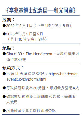 為紀念李兆基,恒基兆業地產集團旗下、位處中環美利道的商廈The Henderson將於5月1日至5日舉行《李兆基博士紀念展—和光同塵》,透過四大篇章呈現四叔傳奇一生的足跡與精神面貌。是次展覽免費開放予公眾參觀,已於日前開放預約,並設有限現場名額供即場登記。