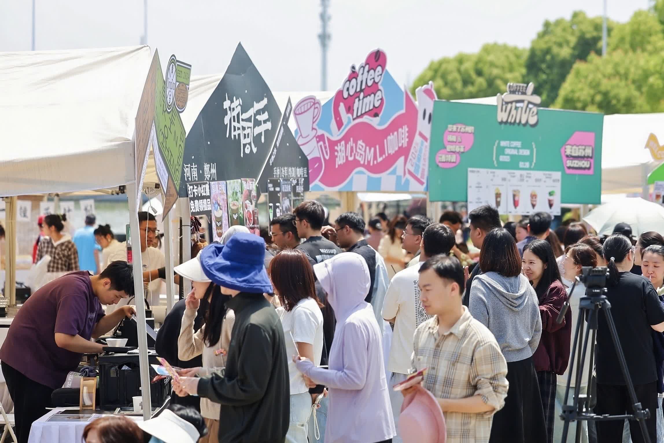 活動現場,熱鬧非凡。來自大連、鄭州、蘇州、景德鎮等不同城市的80多個咖啡品牌及文創美食潮牌齊聚一堂,與本地咖啡餐飲企業一同展現着融合魅力與文化底蘊的交織互動。