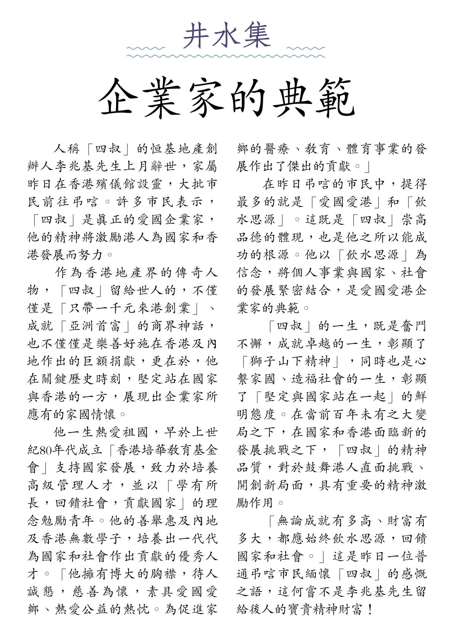 在昨日弔唁的市民中,提得最多的就是「愛國愛港」和「飲水思源」。這既是「四叔」崇高品德的體現,也是他之所以能成功的根源。他以「飲水思源」為信念,將個人事業與國家、社會的發展緊密結合,是愛國愛港企業家的典範。