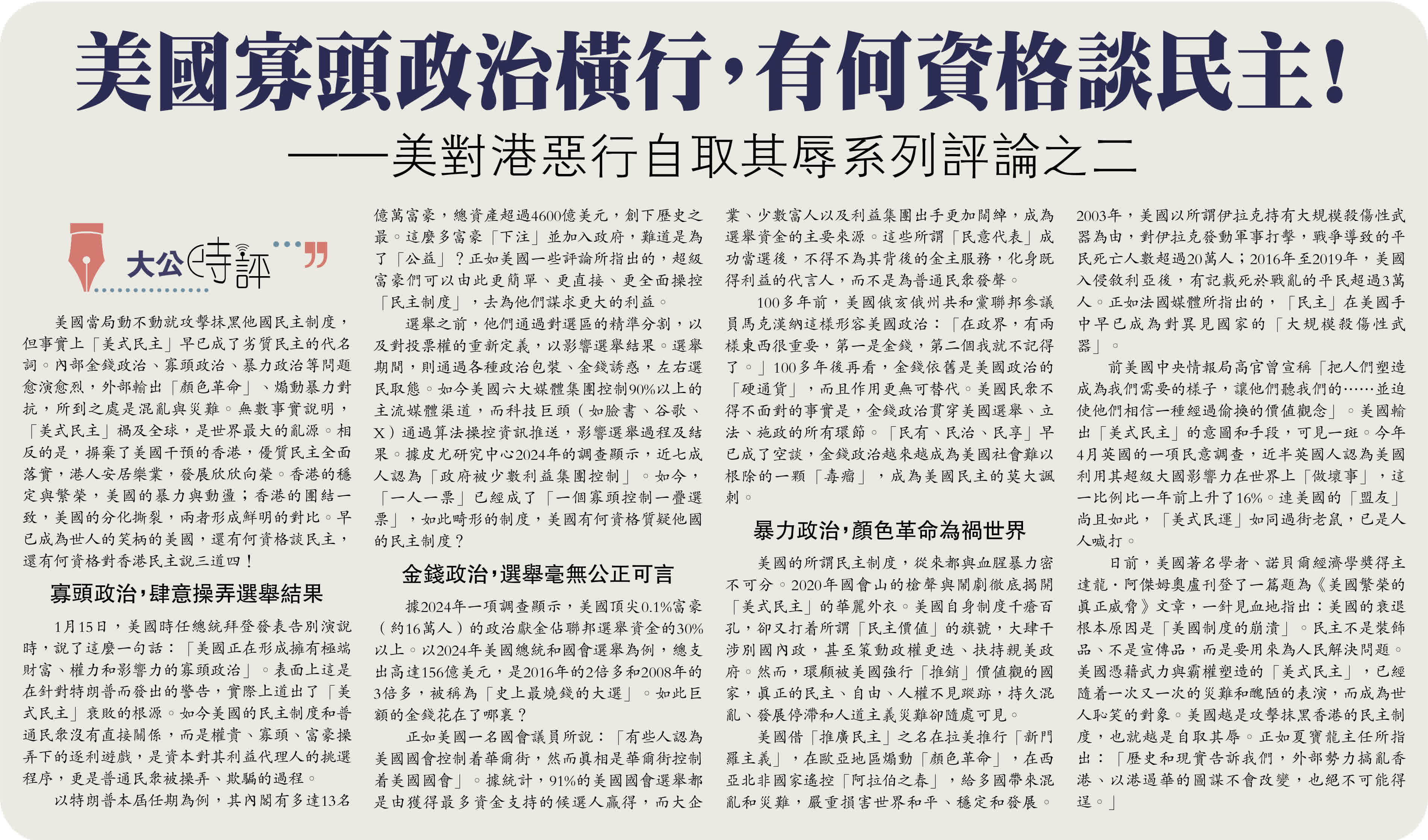 美國當局動不動就攻擊抹黑他國民主制度,但事實上「美式民主」早已成了劣質民主的代名詞。內部金錢政治、寡頭政治、暴力政治等問題愈演愈烈,外部輸出「顏色革命」、煽動暴力對抗,所到之處是混亂與災難。無數事實說明,「美式民主」禍及全球,是世界最大的亂源。相反的是,摒棄了美國干預的香港,優質民主全面落實,港人安居樂業,發展欣欣向榮。香港的穩定與繁榮,美國的暴力與動盪;香港的團結一致,美國的分化撕裂,兩者形成鮮明的對比。早已成為世人的笑柄的美國,還有何資格談民主,還有何資格對香港民主說三道四!