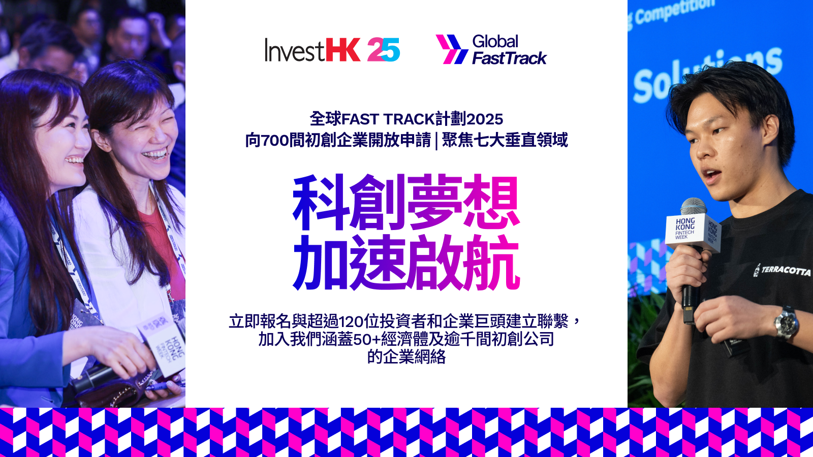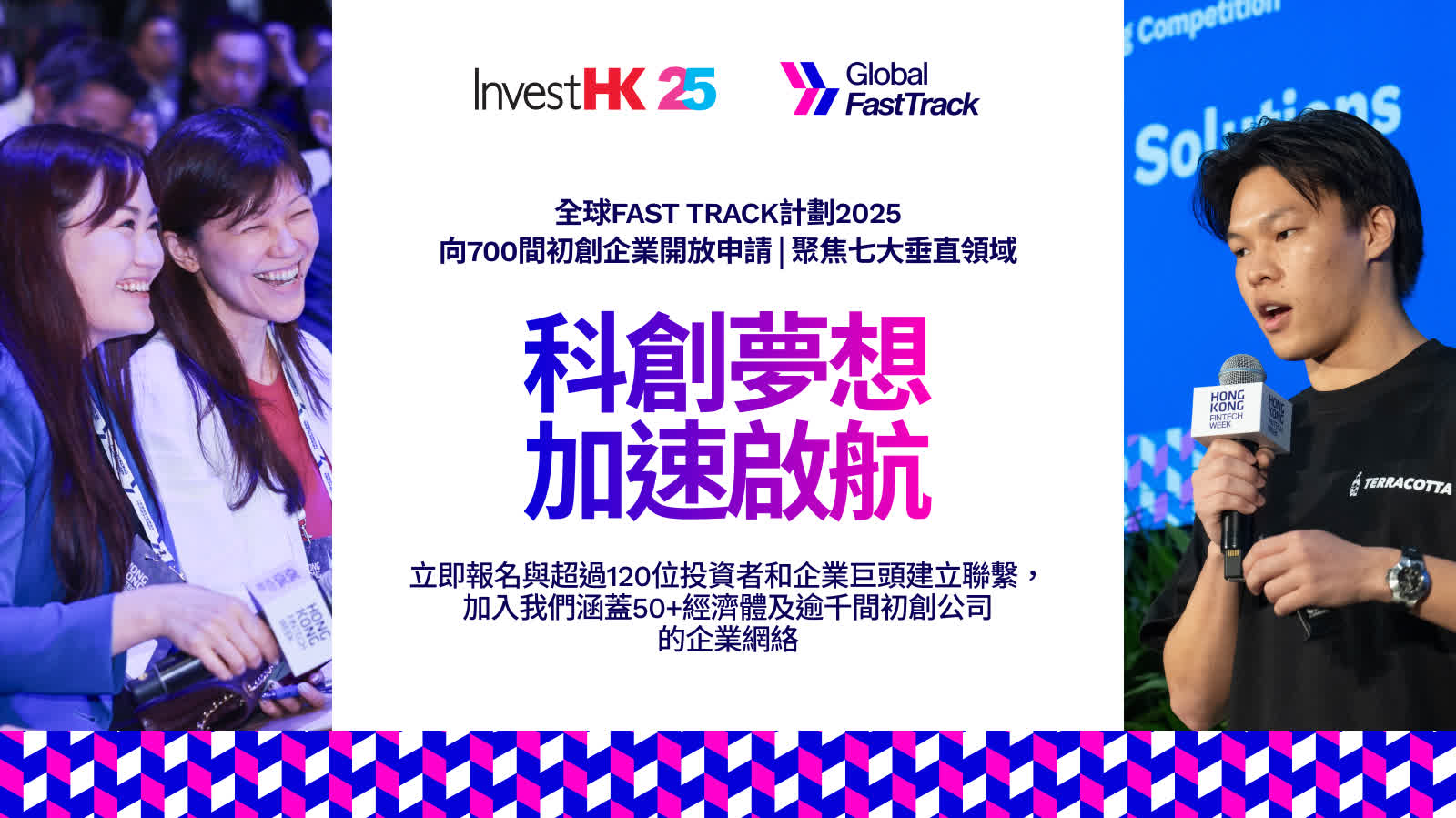 投資推廣署公布第八屆全球Fast Track計劃2025(計劃)現已接受報名,截止日期為九月二十一日。今年,計劃將擴展至金融科技以外的其他垂直領域,為更多香港及全球的科技公司帶來商機。整年的計劃將透過線上及線下形式為參加者提供一對一會議、現場展示機會、行業專家指導,以及與企業客戶、投資者和服務供應商進行度身訂造的商業配對。此外,計劃會於各個垂直領域中挑選公司晉身準決賽,獲選者可於十一月舉行的香港金融科技周x StartmeupHK創業節2025參與現場展示,而總決賽會在主論壇舉行。成功入圍的公司更可在香港金融科技周x StartmeupHK創業節期間參與連串交流活動,與潛在合作夥伴建立聯繫。
