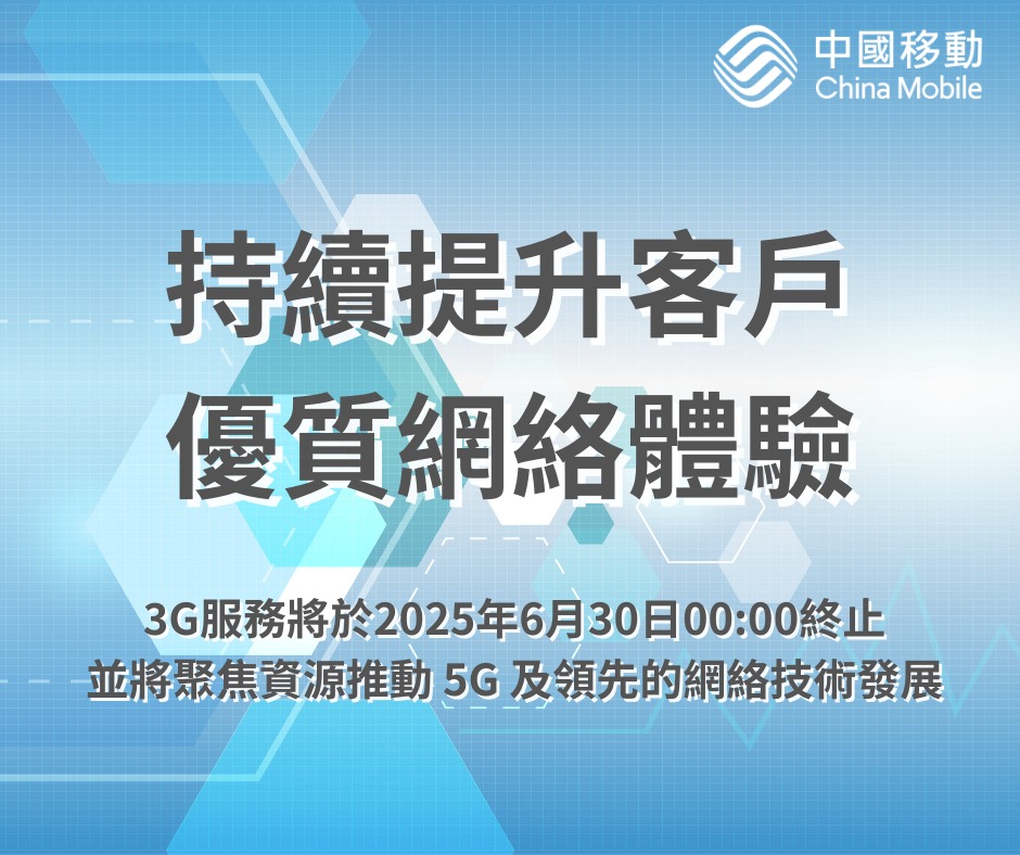 大公文匯全媒體報道,中國移動香港今日(28日)宣布,將於6月30日凌晨零時起終止提供3G服務,以聚焦資源推動5G及領先的網絡技術發展。