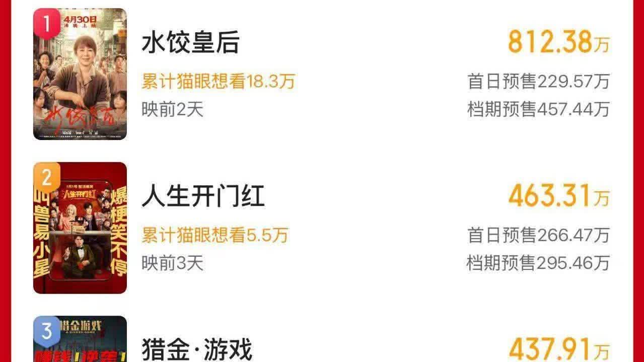 據網絡平台數據,截至4月28日18時29分,2025年五一檔新片預售總票房破3000萬,《水餃皇后》《人生開門紅》《獵金·遊戲》分列前三位。
