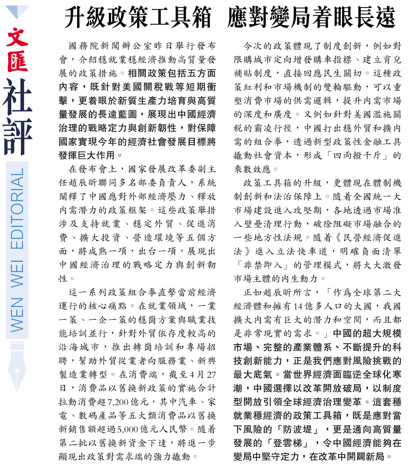 國務院新聞辦公室昨日舉行發布會,介紹穩就業穩經濟推動高質量發展的政策措施。相關政策包括五方面內容,既針對美國關稅戰等短期衝擊,更着眼於新質生產力培育與高質量發展的長遠藍圖,展現出中國經濟治理的戰略定力與創新韌性,對保障國家實現今年的經濟社會發展目標將發揮巨大作用。