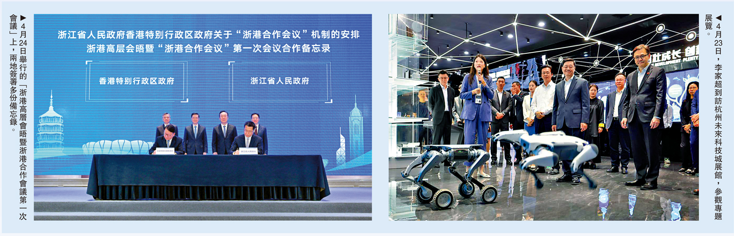(大公報記者 王莉、茅建興、李清)4月22日至25日,香港特區行政長官李家超率團在浙江展開訪問行程,先後到訪杭州、寧波的創新科技機構與企業,參加投資香港推介大會─浙江(寧波)專場暨甬港經濟合作論壇。其間,浙港高層會晤暨「浙港合作會議」首次會議在杭州召開,浙港確立了13項重點合作領域、共51個項目,兩地之間全方位交流合作再上新台階。