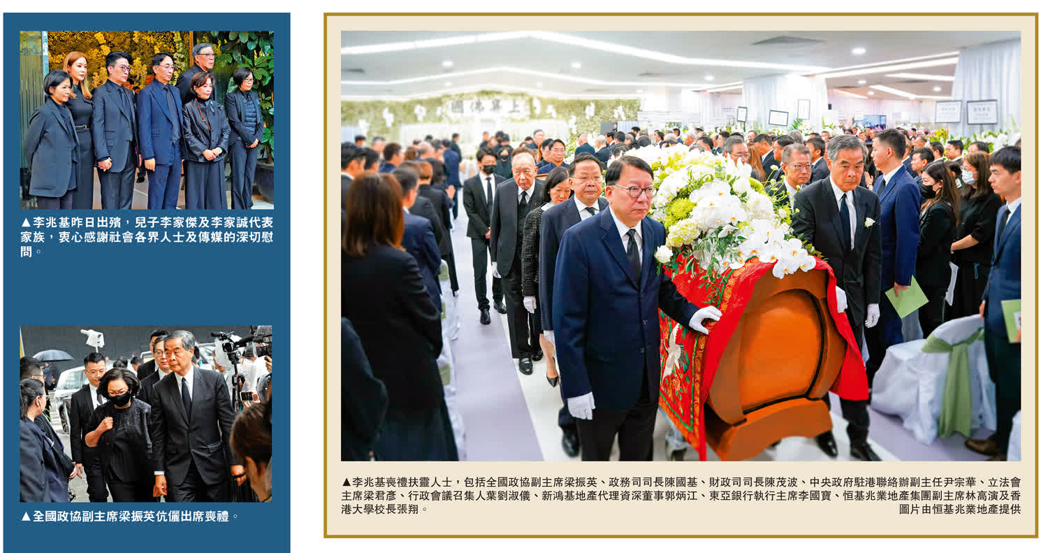 大公報專題報道。恒基兆業地產集團創辦人李兆基於3月17日安詳離世,積閏享壽一百歲。李家周日在北角香港殯儀館設靈,昨日出殯。喪禮由政商界翹楚擔任扶靈人,包括全國政協副主席梁振英、財政司司長陳茂波及中央政府駐港聯絡辦副主任尹宗華等。李兆基於昨日中午12時30分辭靈出殯,由集團兩位聯席主席李家傑及李家誠代表家族,衷心感謝社會各界人士及傳媒的深切慰問。點擊閱讀詳情