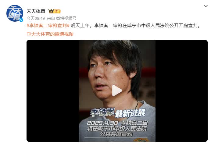 北京廣播電視台《天天體育》官方微博4月29日消息,明天(4月30日)上午,李鐵案二審將在咸寧市中級人民法院公開開庭宣判。