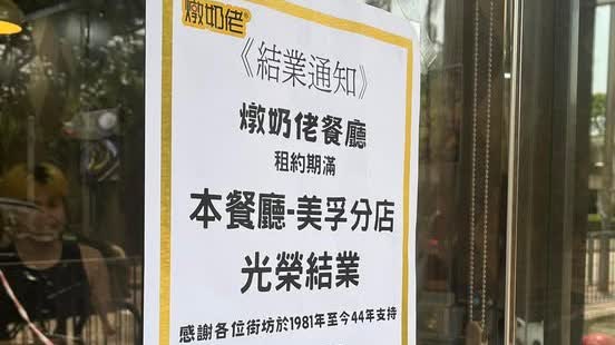 大公文匯全媒體報道,本港再有食肆宣布結業。已有44年歷史的連鎖茶餐廳「金裝燉奶佬」,近日在美孚分店張貼告示,稱將營運至5月29日。「金裝燉奶佬」是香港一家老派茶餐廳,該品牌全盛時期曾有逾20家分店,至去年底天水圍分店結業後,全港僅剩下美孚店。