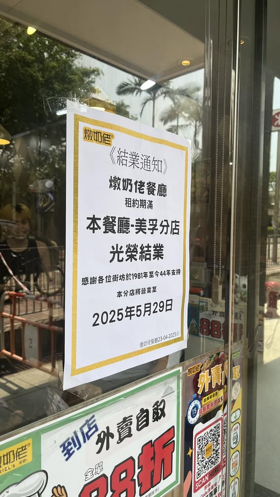 有網民昨日於社交平台上載照片公布此消息,並留言補充:「好似係最後一間分店」,引發網民討論。告示寫道,因餐廳租約已滿,故光榮結業,又感謝街坊自1981年至今44年支持,最後註明美孚分店將營業至2025年5月29日。