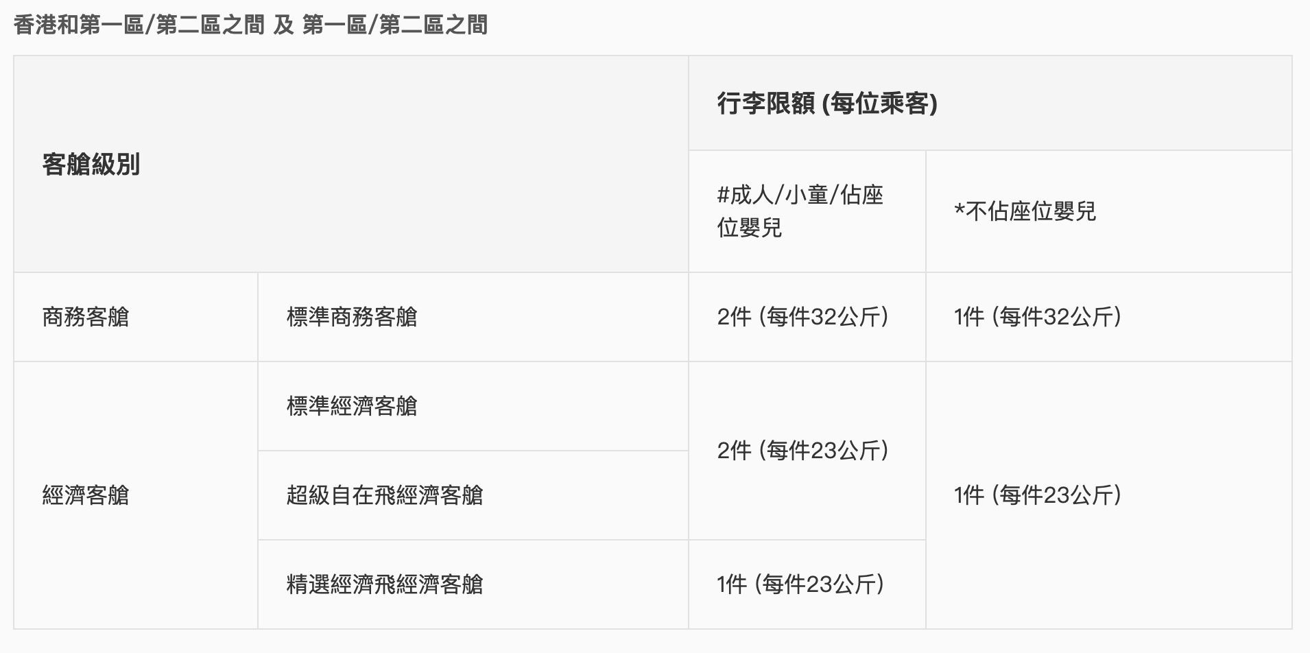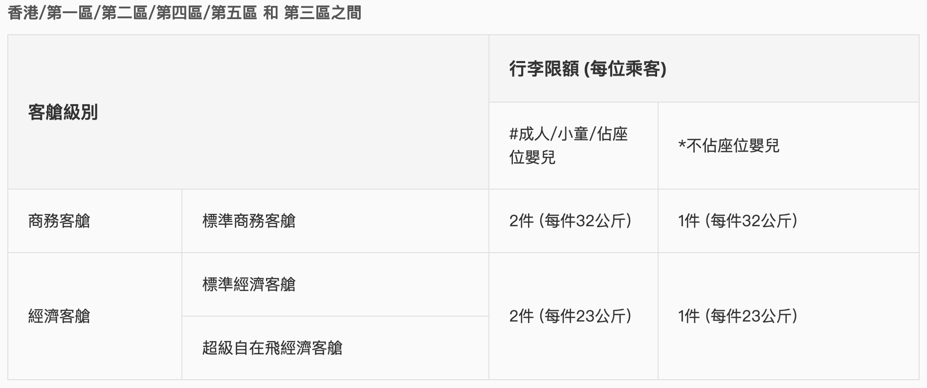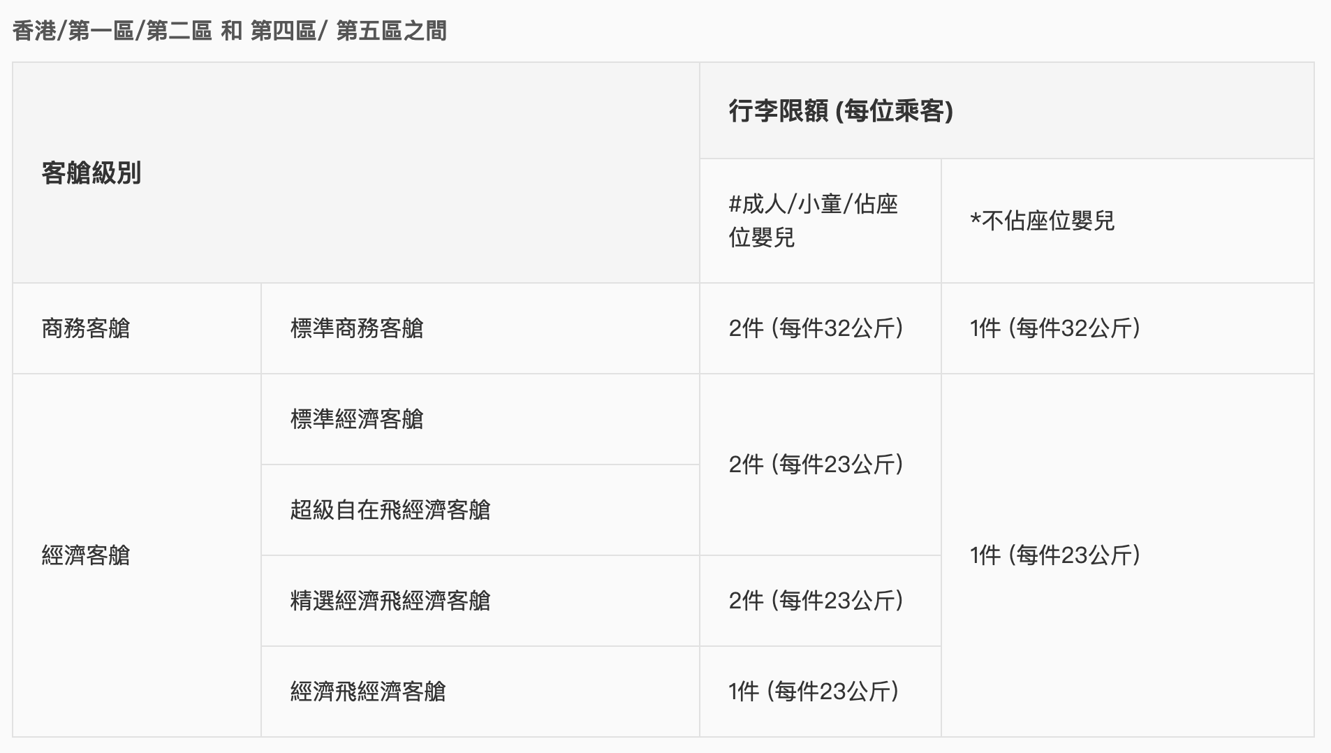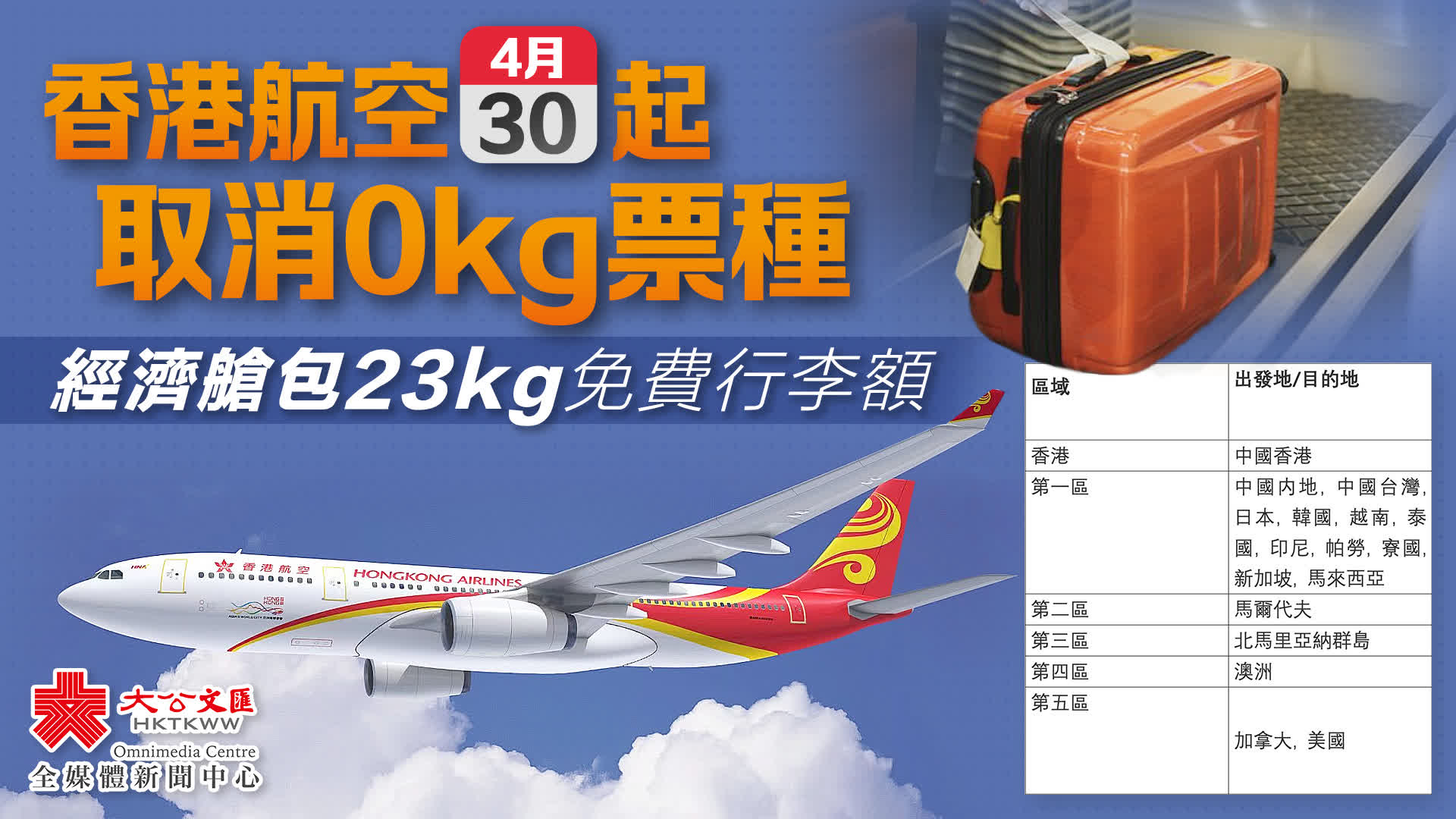 在經濟艙方面,成人、小童、佔座位嬰兒及不佔座位嬰兒,均可享有一件23公斤行李的免費託運服務;而選擇「標準經濟客艙」及「超級自在飛經濟客艙」的乘客,則可免費託運兩件23公斤行李。此外,香港航空全面取消了「0kg寄艙行李」的票種選擇。