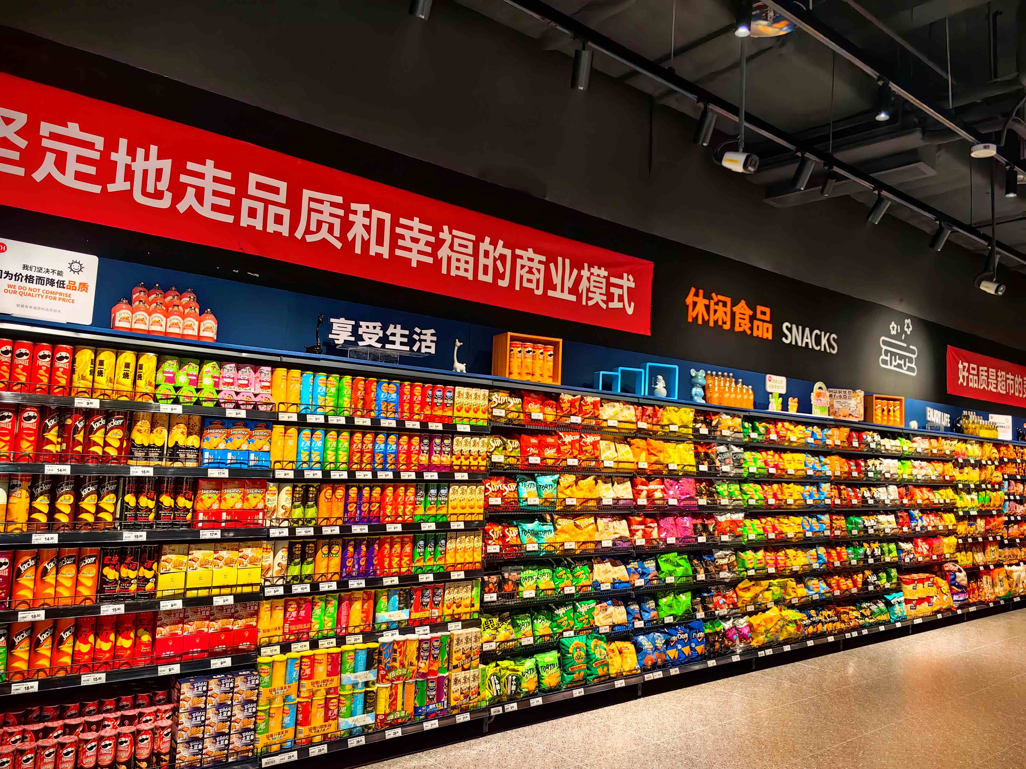 空間設計上,超寬通道、便民服務點內的身高/血壓測量儀、微波爐等細節拉滿,調味品貨架懸掛放大鏡方便老年顧客閱讀標籤,卷袋旁設置了濕手器破解「撕袋尷尬」,散裝食品標註「1斤約多少個」解決選擇困難症。羅湖店以灰橙主色調+射燈聚焦商品,營造「煙火氣+潮流感」購物場景。