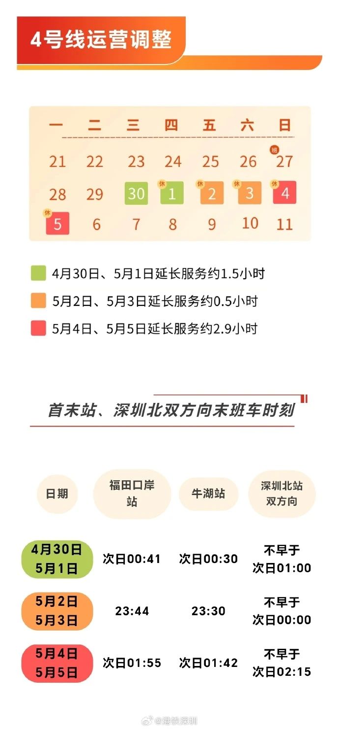 深圳地鐵4號線將於4月30日至5月5日延長服務時間,其中4月30日及5月1日福田口岸站末班車將於次日零時41分發車,深圳北站末班車不早於次日凌晨1時;5月4日及5月5日,福田口岸站末班車將於次日凌晨1時55分發車,深圳北站末班車不早於次日凌晨2時15分。