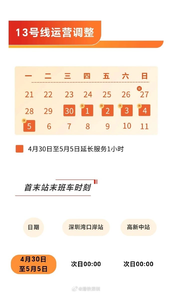 深圳地鐵13號線將於4月30日至5月5日延長服務1小時,期間深圳灣口岸站的末班車將於次日零時發車。