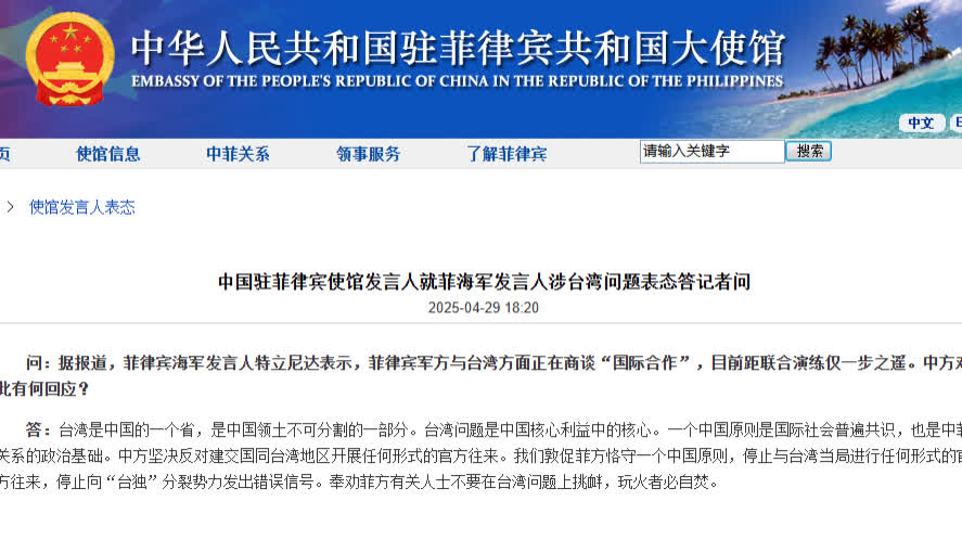 大公文匯網報道,中國駐菲律賓使館發言人今日(29日)就菲海軍發言人涉台灣問題表態答記者問。
