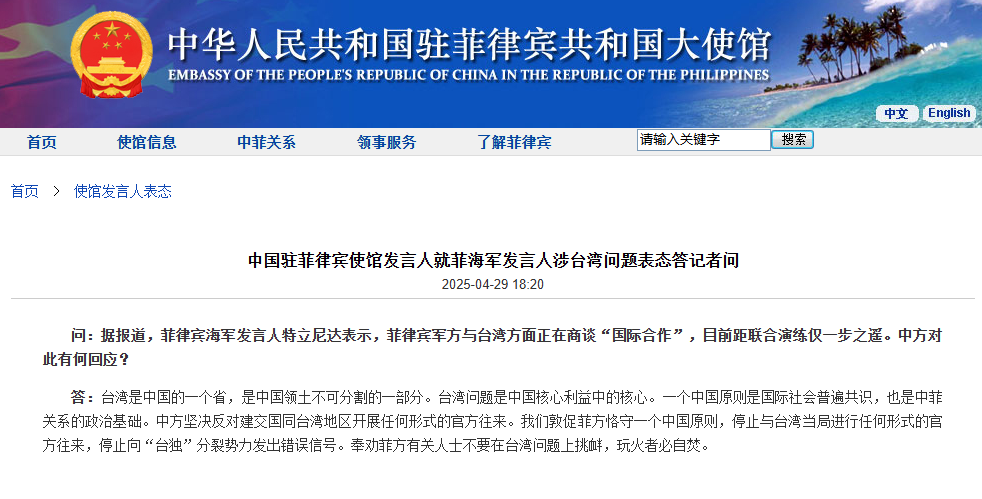 發言人表示,台灣是中國的一個省,是中國領土不可分割的一部分。台灣問題是中國核心利益中的核心。一個中國原則是國際社會普遍共識,也是中菲關係的政治基礎。中方堅決反對建交國同台灣地區開展任何形式的官方往來。我們敦促菲方恪守一個中國原則,停止與台灣當局進行任何形式的官方往來,停止向「台獨」分裂勢力發出錯誤信號。奉勸菲方有關人士不要在台灣問題上挑釁,玩火者必自焚。