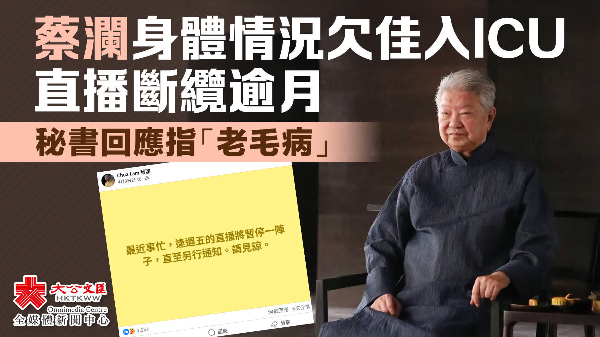 大公文匯全媒體報道,83歲的香港四大才子之一蔡瀾最近被指身體出現問題,情況欠佳至需留醫深切治療部。有報道表示曾聯絡蔡瀾的秘書了解其情況,秘書回覆指蔡瀾是老毛病:「老毛病休息一下就好,沒大礙的不用擔心。」