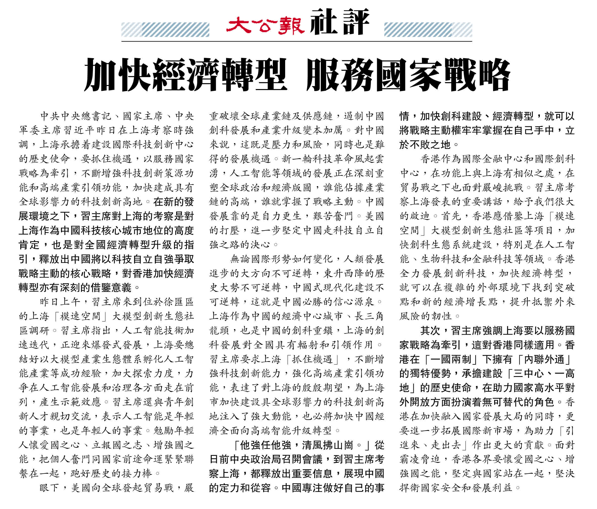 香港作為國際金融中心和國際創科中心,在功能上與上海有相似之處,在貿易戰之下也面對嚴峻挑戰。習主席考察上海發表的重要講話,給予我們很大的啟迪。首先,香港應借鑒上海「模速空間」大模型創新生態社區等項目,加快創科生態系統建設,特別是在人工智能、生物科技和金融科技等領域。香港全力發展創新科技,加快經濟轉型,就可以在複雜的外部環境下找到突破點和新的經濟增長點,提升抵禦外來風險的韌性。
