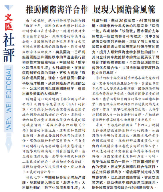 由「蛟龍號」執行科學考察的聯合國「海洋十年」國際合作大科學計劃航次研討會昨日在香港舉行。隨着科技進步與資源需求增加,深海開發的爭議日益加劇,美國總統特朗普近期更單方面宣布擴大國際水域的深海採礦,嚴重破壞國際海洋治理秩序。與美國為一己私利無視國際法和國際秩序的單邊主義行徑和霸權本質截然相反,中國發起「數字化深海典型生境」大科學計劃,在推動深海科研保育的同時,更致力實踐「海洋命運共同體」理念,協助發展中國家爭取海洋權益,通過保障海洋管理的公平、公正和透明以維護國際秩序,彰顯出勇於擔當的大國風範。