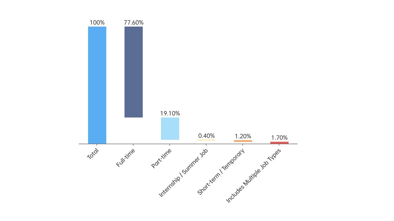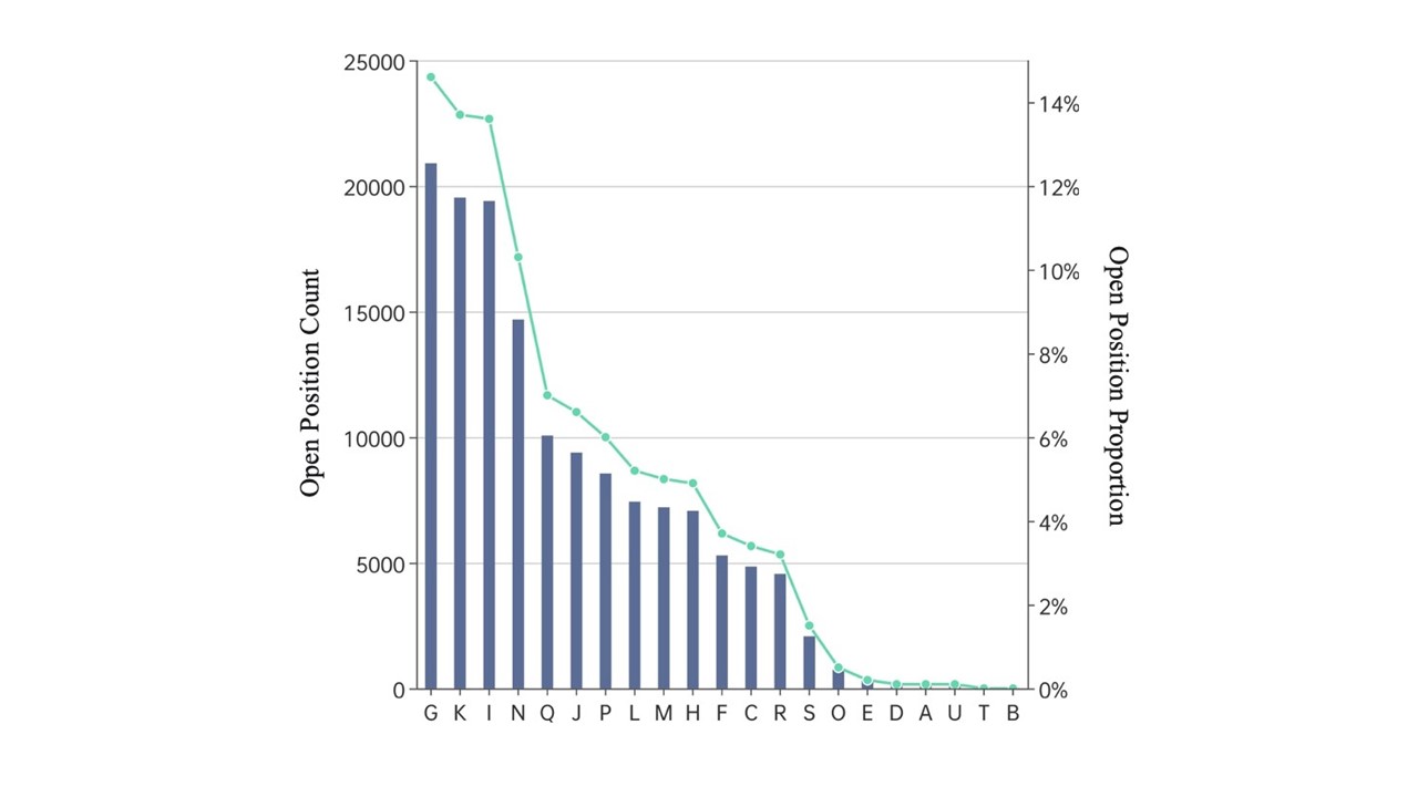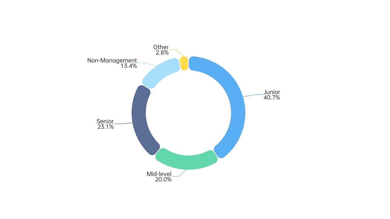 The findings indicate that the recruitment market in Hong Kong remains dominated by traditional service industries, with over 40 per cent of job demand from import-export (including wholesale and retail), finance and insurance, and accommodation and food services sectors. Each of these three sectors accounts for approximately 20,000 job vacancies (Figure 1). Therefore, the stability of each of these positions is directly affected by the risks posed by US-China trade tensions. 83.9 per cent of vacancies are full-time, with 40.7 per cent being entry-level positions, and 23.1 per cent classified as senior roles (Figure 2). Regarding job content, managerial and service-oriented roles account for over 60 per cent of the total, reflecting Hong Kong's established service-based economy.
