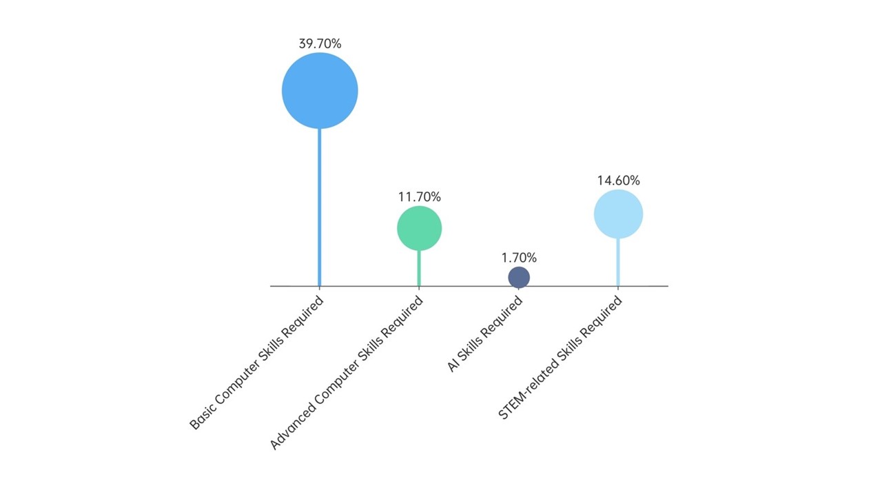 Hong Kong has been vigorously developing an intelligent economy in recent years, and promoting the implementation of artificial intelligence and innovative technology industries. However, this study found that the recruitment market now demands mainly basic skills, with 39.7 per cent of jobs posted seeking candidates who possess basic digital literacy, 11.7 per cent requesting advanced computer skills, but fewer than two per cent of vacancies indicating a need for advanced technologies such as AI and big data (Figure 3). Nearly 60 per cent of job vacancies have low-threshold requirements, with no need for post-secondary education, although almost 30 per cent require a university degree or higher. In terms of soft skills, job advertisements emphasise practical qualities such as teamwork, attention to detail, and proactiveness, with a relatively lower demand for creativity.