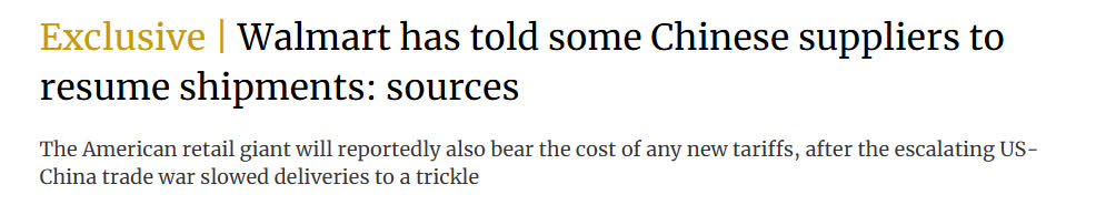 據《南華早報》29日報道,美國零售巨頭沃爾瑪已通知部分其中國供應商恢復發貨。據報道,寧波一家文具和辦公用品出口商收到沃爾瑪關於恢復對美正常發貨的通知。該公司表示,新關稅的成本將由美方買家承擔。