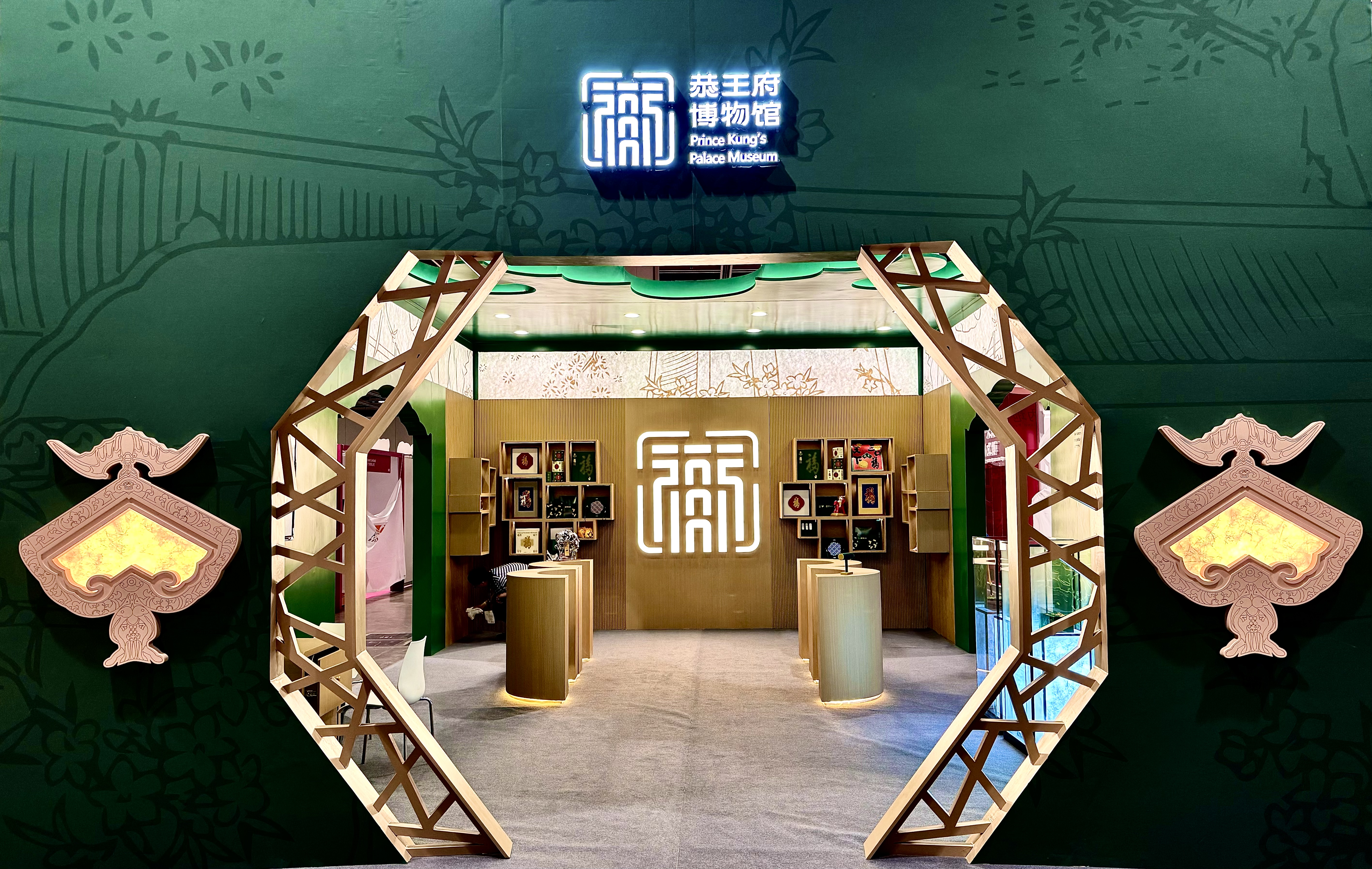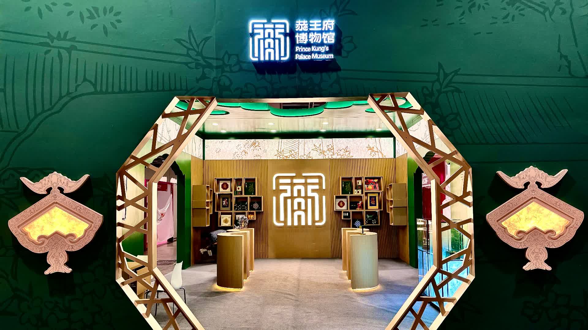 展區正門創新性地採用恭王府內抄手遊廊的冰裂紋窗欞元素,頂部裝飾的蝙蝠紋鏤空造型則巧妙呼應了恭王府作為「萬福之地」蘊含的深厚「福」文化內涵。引人注目的背景牆更是巧妙地將恭博館標「福在府中」的恭王府建築群空間造型轉化為與公眾間開放互動的展陳語言,展現出恭博在時空維度上不斷延伸探索、推陳出新、與古為新的精神及開放共享的格局。觀眾步入整個展區,彷彿打開了一隻巨型「綠盒子」,可以盡情沉浸在琳琅滿目的「恭博禮物」之中。