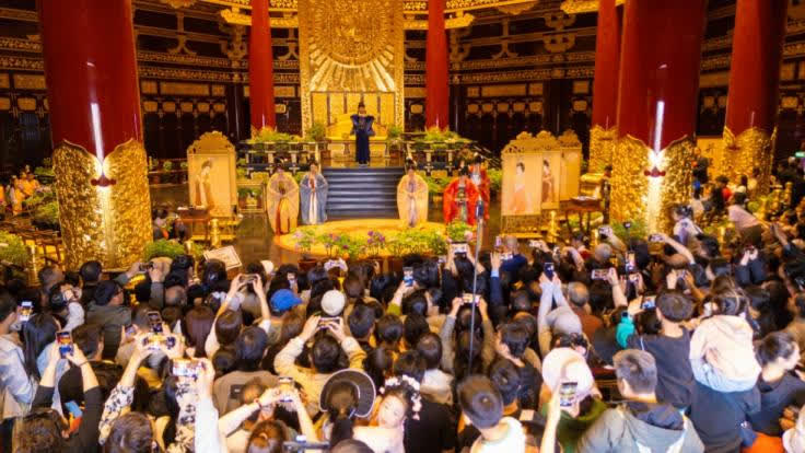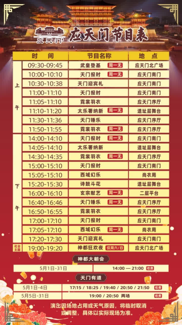 全天127場國風常態演出輪番上演,好戲不斷。5月1日至4日期間,每天上午9:30,應天門北廣場上新武皇登基,19:00,免費開啟神都蹦迪,上午登基、下午蹦迪,應天門北廣場熱鬧不停,可中!