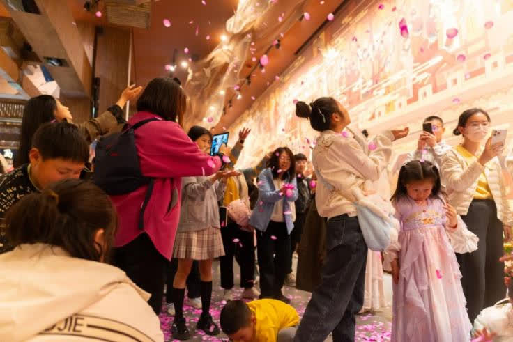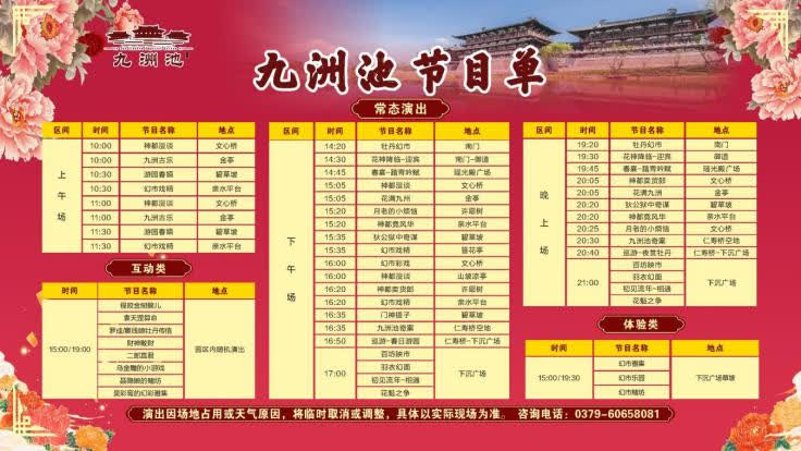 來到九洲池,互動演出形式多樣。九洲池南門、御道進行儀式感的迎賓禮和樂舞表演,百花仙子和牡丹八品齊聚亮相,更有程咬金、袁天罡、財神等多位互動演員在園區內隨機出現,贏取銀票為你心中的花仙投票,解鎖更多隱藏劇情。