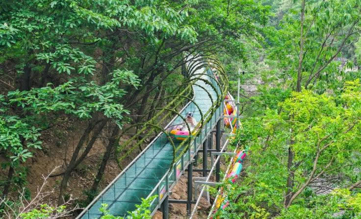 龍潭大峽谷的崖壁滑漂,是一場穿梭於時光褶皺的冒險,900米全透明滑道貼着懸崖呼嘯而下,連續落差、迴旋彎道,風在耳邊呼嘯,尖叫與浪花一同騰空,心跳直接飆到180,連頭髮絲都在喊:「太爽啦」。